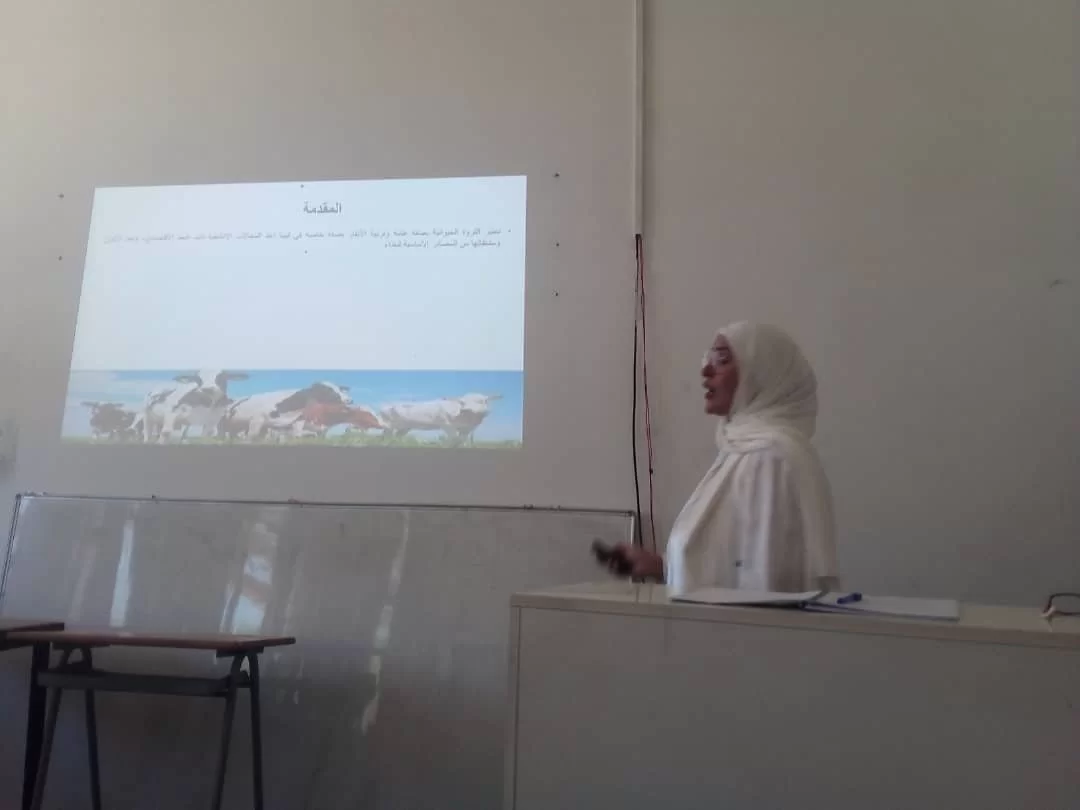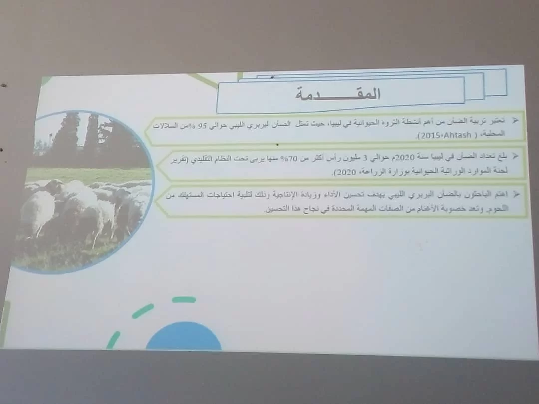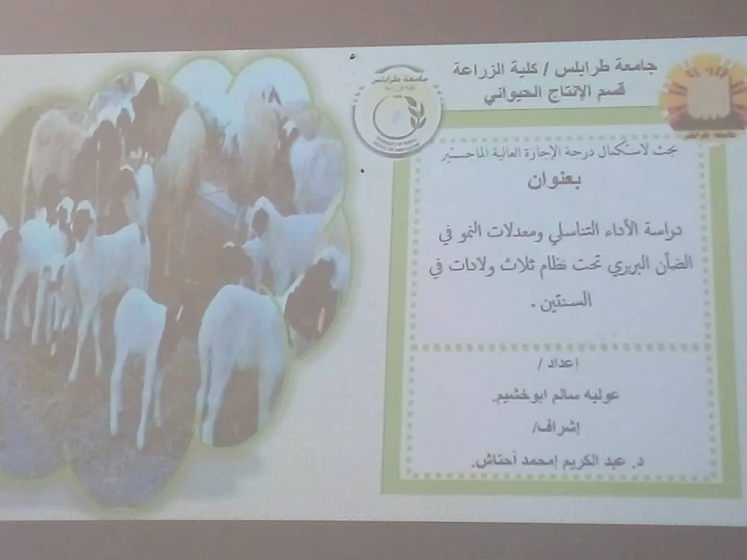 الطالبة عولية سالم أبوخشيم بتاريخ 6-9-2023 عن رسالة الماجستير الموسومة بعنوان "دراسة الأداء التناسلي ومعدلات النمو في الضأن البربري تحت نظام ثلاثة ولادات في السنتين" بإشراف اللجنة المكونة من السادة:
