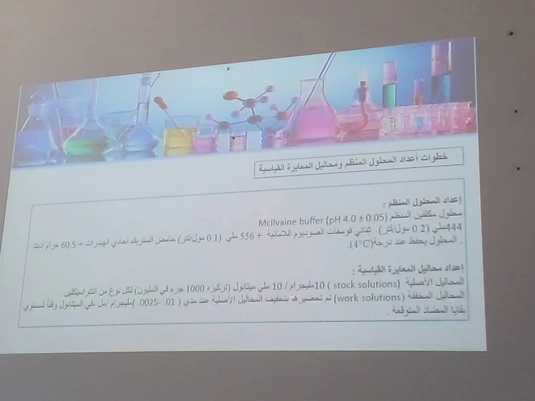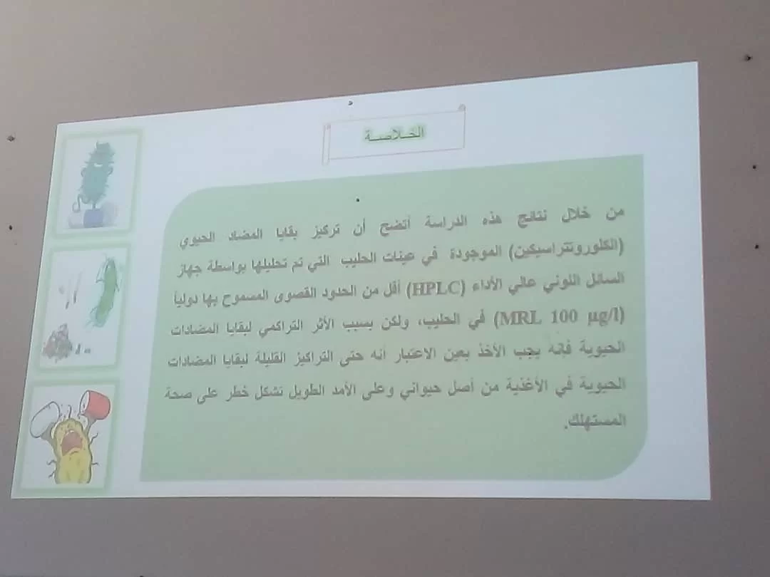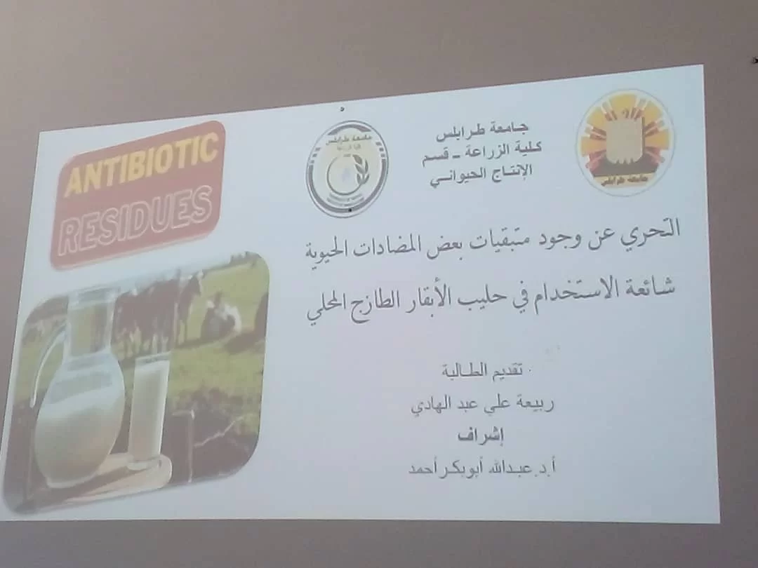 الطالبة ربيعة عبد الهادي عوينة بتاريخ 15-6-2023 عن رسالة الماجستير الموسومة بعنوان "تحري عن وجود متبقيات المضادات الحيوية شائعة الاستخدام في حليب الأبقار الطازج" بإشراف اللجنة المكونة من السادة: