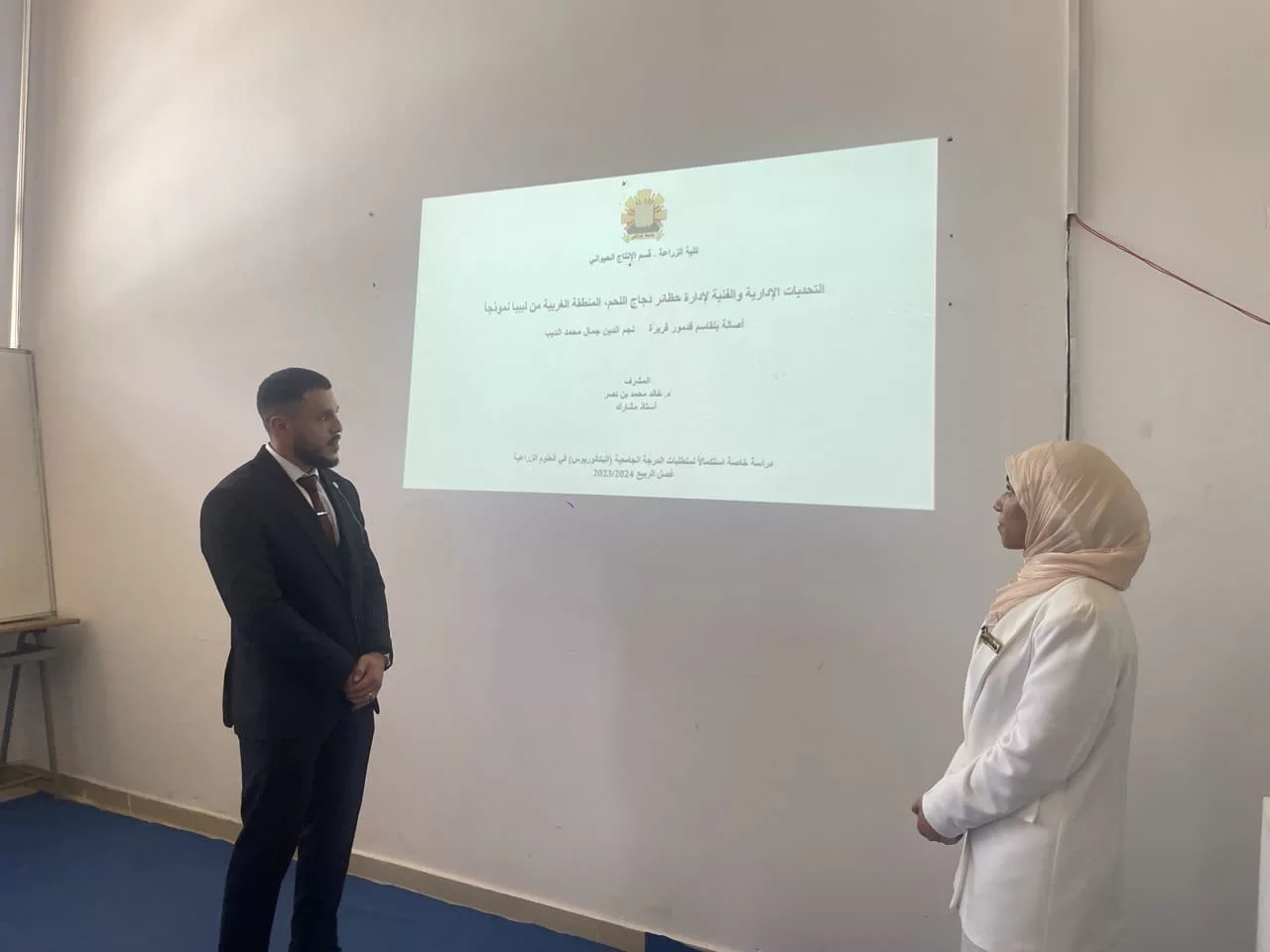 الطالب نجم الدين الديب والطالبة أصالة قدمور في دراسة حقلية بعنوان (التحديات الإدارية والفنية لإدارة حظائر دجاج اللحم المنطقة الغربية من ليبيا نموذجاً) تحت إشراف د. خالد بن نصر.