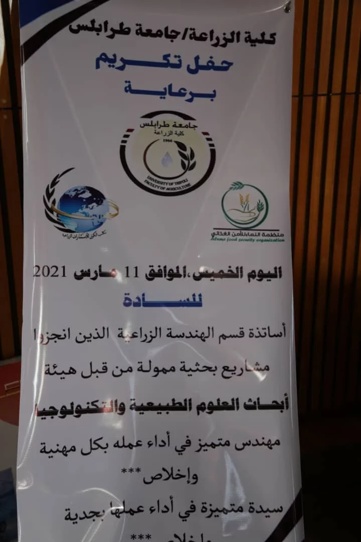 برعاية كلية الزراعة، ومنظمة النماء للأمن الغذائي، ومكتب الكون للاستشارات الزراعية، أقيم صباح يوم الخميس، 27 رجب 1442هـ الموافق: 11 مارس 2021م، حفل تكريم لأستاذين من قسم الهندسة الزراعية أنجزا بحثيهما الممولين من قبل هيئة أبحاث العلوم الطبيعية والتكنولوجيا في الوقت المحدد، وهما: