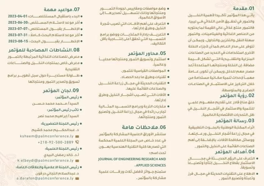 ينعقد المؤتمر العلمي الأول حول تنمية النخيل في ليبيا تحت شعار (رعاية أشجار النخيل لتنمية مستدامة) بتاريخ 05 - 06 سبتمبر 2023م بمدينة هون تنظيم كلية الزراعة، جامعة طرابلس وجمعية مزارعي النخيل بهون .