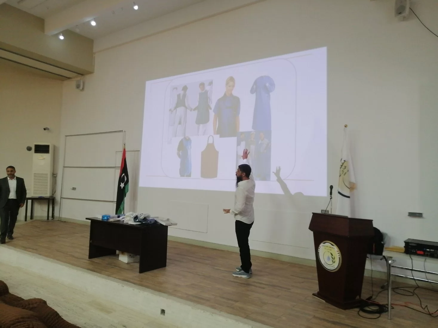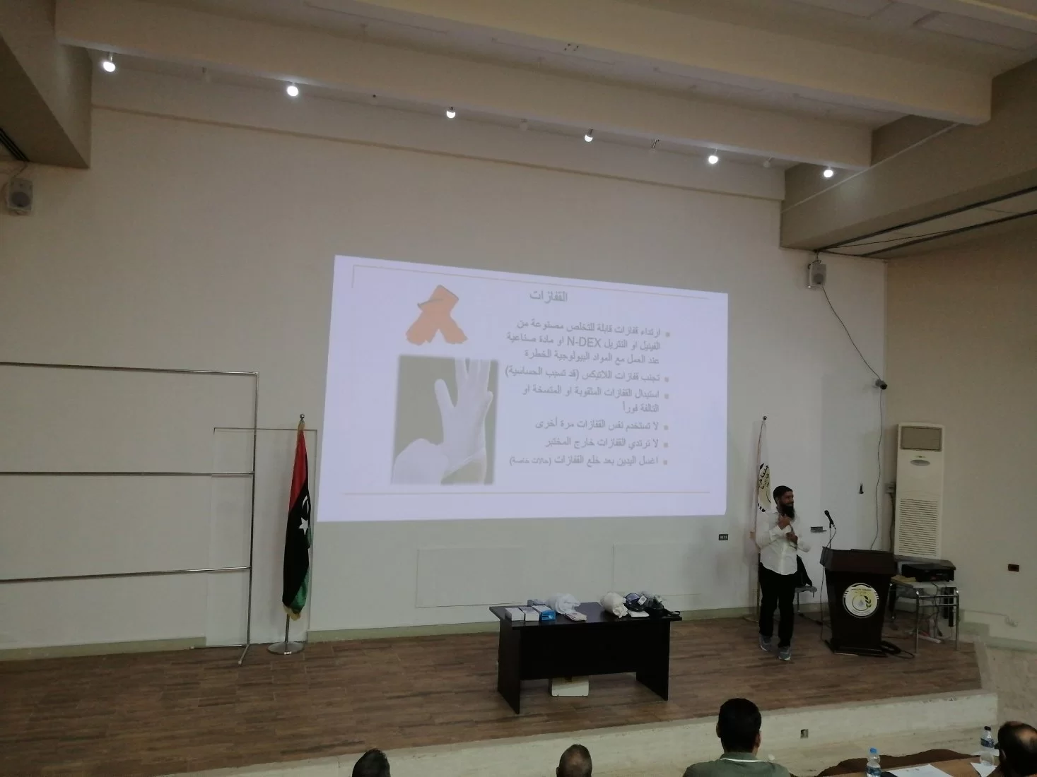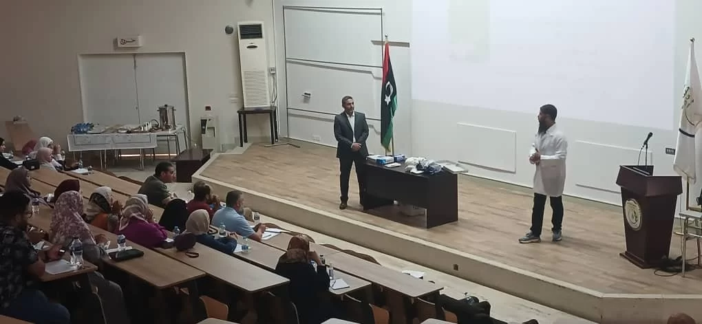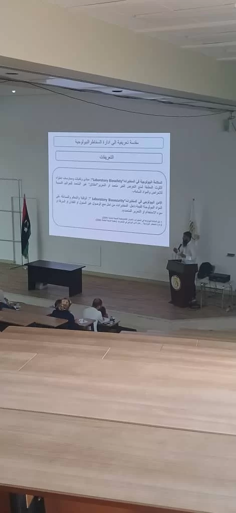 اقام قسم الزراعات المائية بكلية الزراعة بالتعاون مع المركز الوطني لمكافحة الامراض ورشة عمل بعنوان ((ادارة المخاطر البيولجية بالمعامل ))،حيث كانت الفئة المستهدفة منه هذه الورشة هم المهندسين (فنيي المعامل ) والمعيدين بالاقسام العلمية بكلية الزراعة وايضا طلبة الدراسات العليا بالاقسام. حيث نوقش في المحاضرات اليات التعامل مع المخاطر البيولوجية بالمعامل وكيفية ادارة المخاطر بها وكذلك طرق التقليل منها، وفي النهاية تم شرح طرق استعمال ادوات الوقاية الشخصية وكيفية استخدامها في المعمل. كانت الورشة بحضور عميدة كلية الزراعة أ.د. هيفاء دوزان ورئيس قسم الزراعات المائية أ. علي ابوسليانة واعضاء هيئة التدرسي والموظفين بالقسم وبحضور د.عبد الحميد الشريف من المركز الوطني لمكافحة الامراض، وايضا المهندسين والمعيدين وطلبة الدراسات العليا بالكلية.