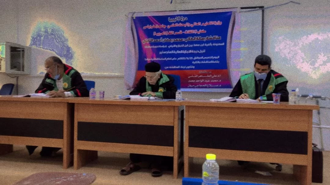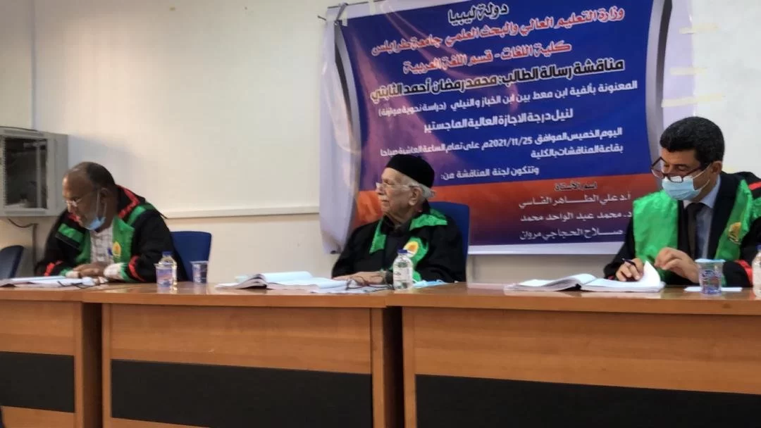 تم ضحى اليوم 2021/11/25 على تمام الساعة العاشرة بقاعة المناقشات بكلية اللغات مناقشة رسالة الماجستير المقدمة من الطالب/ محمد رمضان الثابتي، و الموسومة ب(ألفية ابن معط بين ابن الخباز والنيلي دراسة نحوية موازنة)
