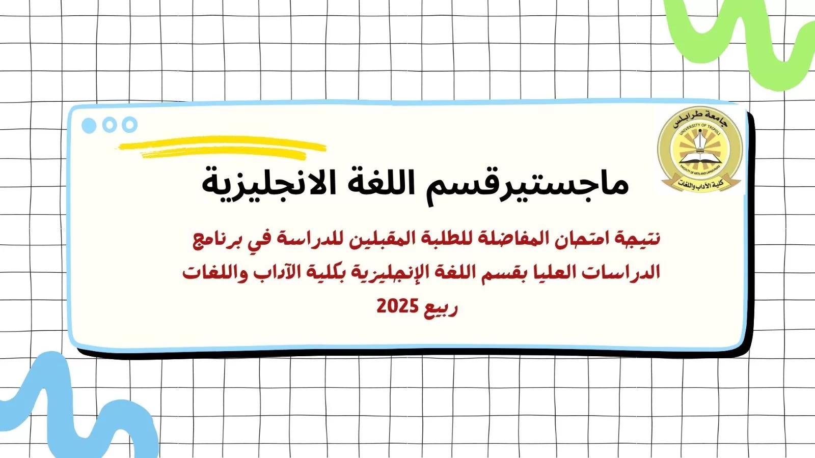 نتيجة امتحان المفاضلة للطلبة المقبلين للدراسة في برنامج الدراسات العليا بقسم اللغة الإنجليزية بكلية الآداب واللغات ربيع2025