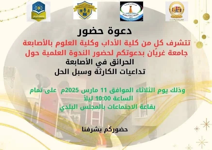 شارك د. محمد إبراهيم اللافي، عضو هيئة التدريس بكلية الآداب و اللغات و رئيس قسم الترجمة بجامعة طرابلس، في الندوة العلمية التي نظمتها كلية العلوم وكلية الآداب بجامعة غريان تحت عنوان *"الحرائق في الأصابعة: الأسباب المحتملة والتداعيات"*. بورقة علمية بعنوان *"الخطاب الإعلامي في الأزما