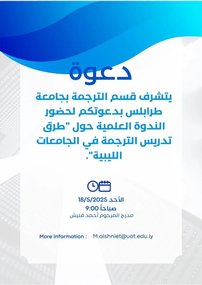يسر قسم الترجمة بجامعة طرابلس أن يدعوكم لحضور ندوة علمية حول موضوع "طرق تدريس الترجمة في الجامعات الليبية".الموعد: الأحد الموافق 18 مايو 2025