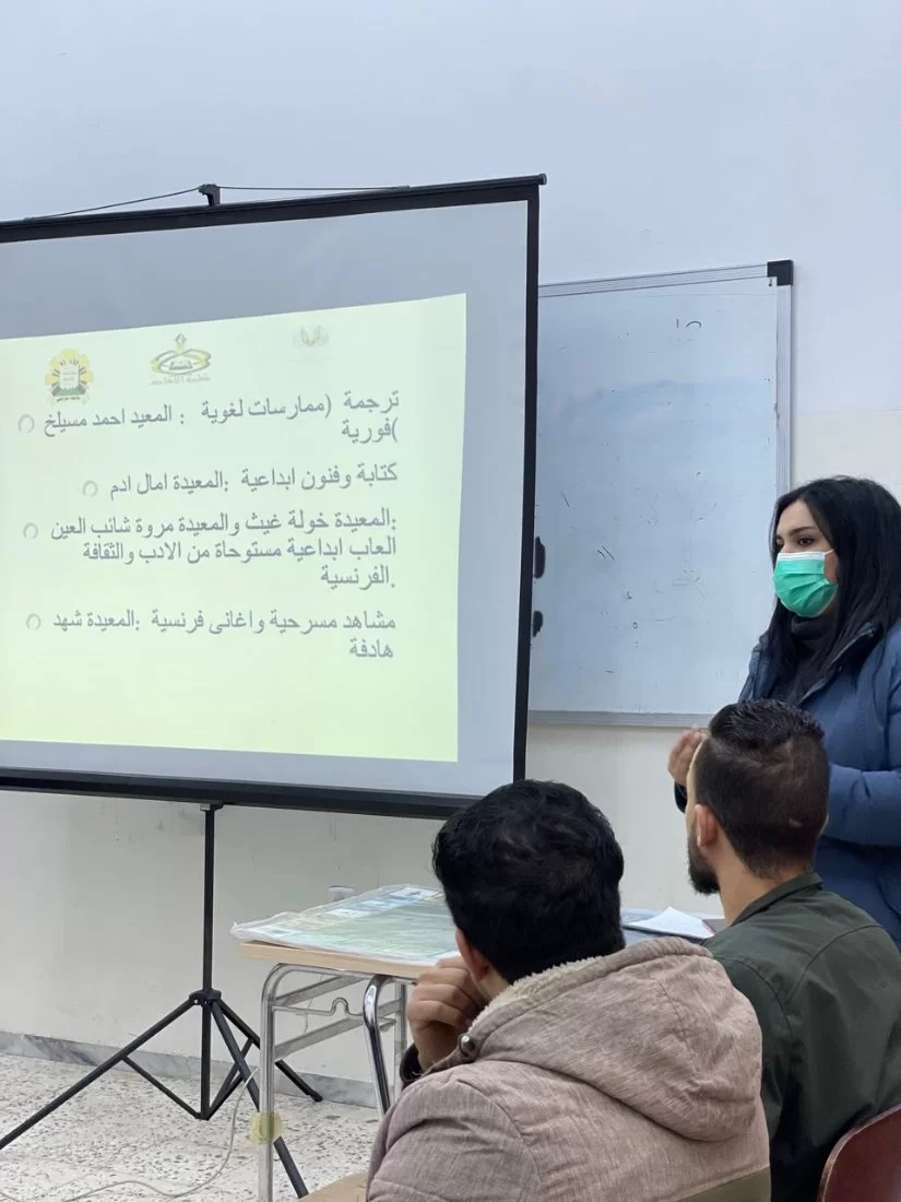 تم اليوم الأحد الموافق 16/1/2022 افتتاح الورشة الابداعية داخل قسم اللغة الفرنسية، والتي تهدف إلى تطوير مهارات التفكير الإبداعي وممارسة اللغة الفرنسية داخل إطار فني ولغوي. وحث الطلبة على التعبير عن ذاتهم والمساهمة في إنجاح النشاط الجامعي.