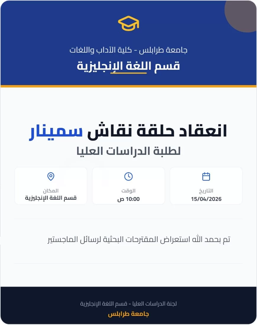 في إطار الأنشطة البحثية والعلمية لقسم اللغة الإنجليزية، عُقدت يوم الأربعاء الموافق 15 أبريل 2026 مناقشات سمينار، وذلك تمهيدًا لتسجيل وقبول الخطط البحثية المقدّمة من طلبة الدراسات العليا.