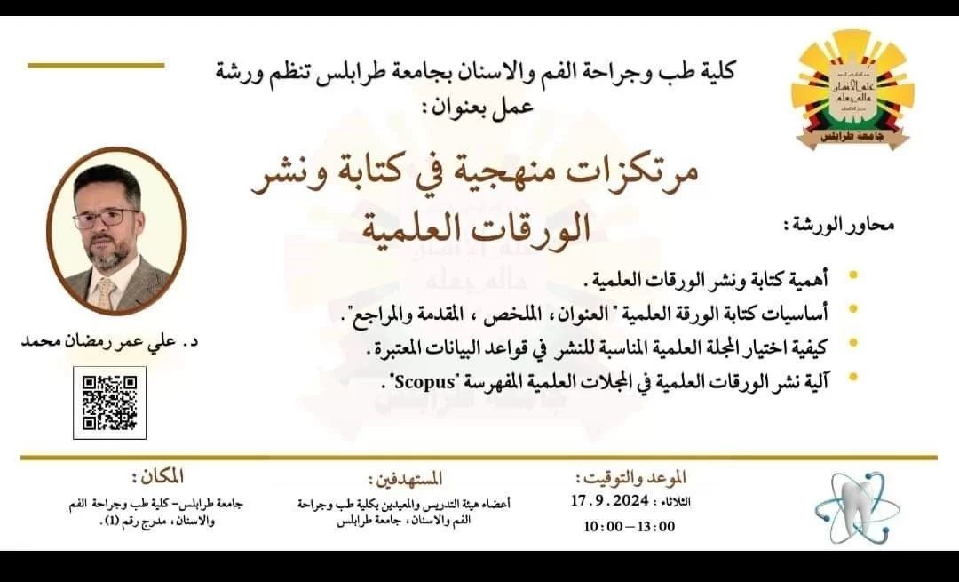 ة معرض الملصقات العلمية لطلاب السنة الرابعة دفعة 32 وذلك يوم الثلاثاء بتاريخ 23/9/2025م بالمبنى الرئيسي بكلية طب وجراحة الفم والاسنان جامعة طرابلس تحت إشراف وحدة طب اسنان الاطفال وسط حضور غفير من الطلاب و اعضاء هيئة التدريس بالكلية ، و قد افتتح هذه الفعاليات ا.د. عميد الكلية، و السيد د. وكي