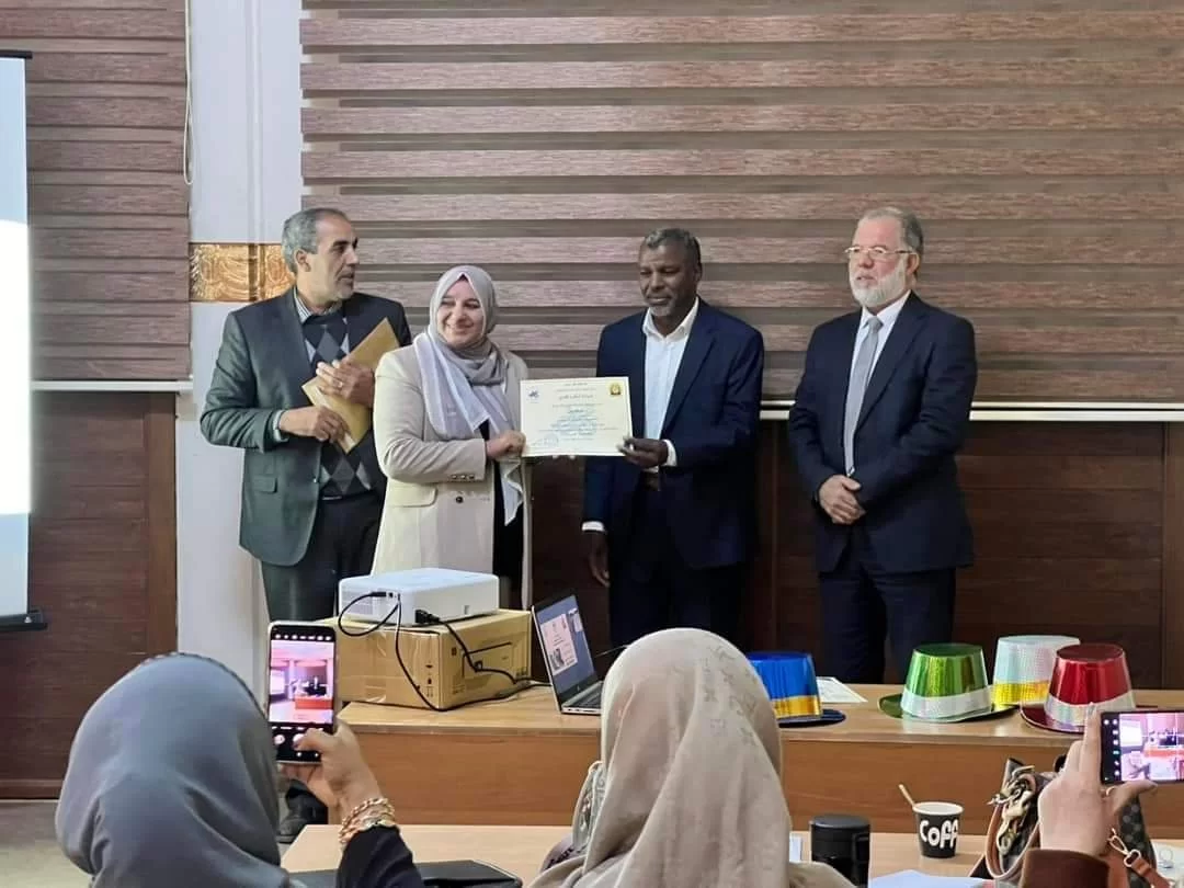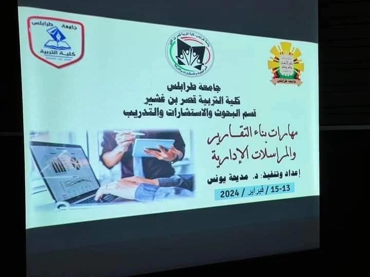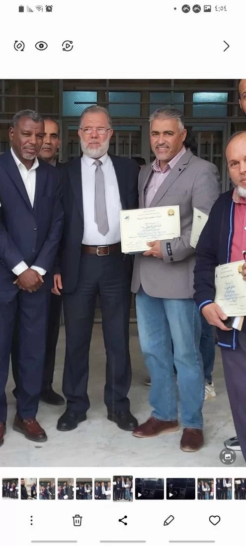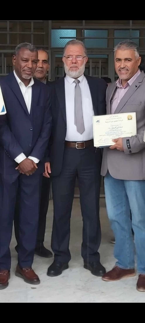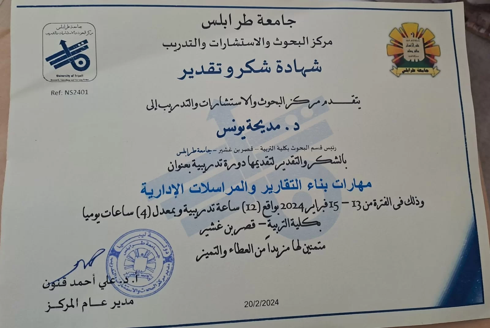 في أجواء رائعة ، وبحضور الدكتور الفاضل/ علي قنون، والاستاذ الكريم رمضان الطويل - ضيوف كليتنا الاعزاء- كذلك بحضور الدكتور الفاضل / إبراهيم البوراصي عميد الكلية ، ومدير قسم التدريب بمراقبة التربية والتعليم قصر بن غشير الاستاذ الكريم/ منصور المجدوب تم توزيع الشهائد على المشتركين في الدورة التدريبية المعنونة ب مهارات بناء التقارير والمراسلات الادارية باحترافية لفائدة بعض رؤساء أقسام و موظفي مراقبتي التربية والتعليم قصر بن غشير ، والسواني, ويحق لهم استلام هذه الشهادة لحضورهم وتفاعلهم المثمر طيلة أيام الدورة التدريبية التي استمرت خمسة أيام، بواقع(15) ساعة تدريبية ، لهم جزيل الشكر والتقدير.