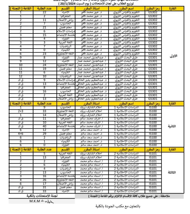توزيع طلاب كافة أقسام الكلية على لجان الامتحانــات. ( يوم السبت 2/3/2024 )