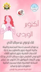 يعتزم قسم خدمة المجتمع و البيئة بالكلية إقامة لقاء توعوي حول سرطان الثدي ، وذلك بالتعاون مع إدارة الخدمات الصحية وذلك يوم الاربعاء الموافق 26/10/2022 عند تمام الساعة العاشرة صباحا بمسرح الكلية .