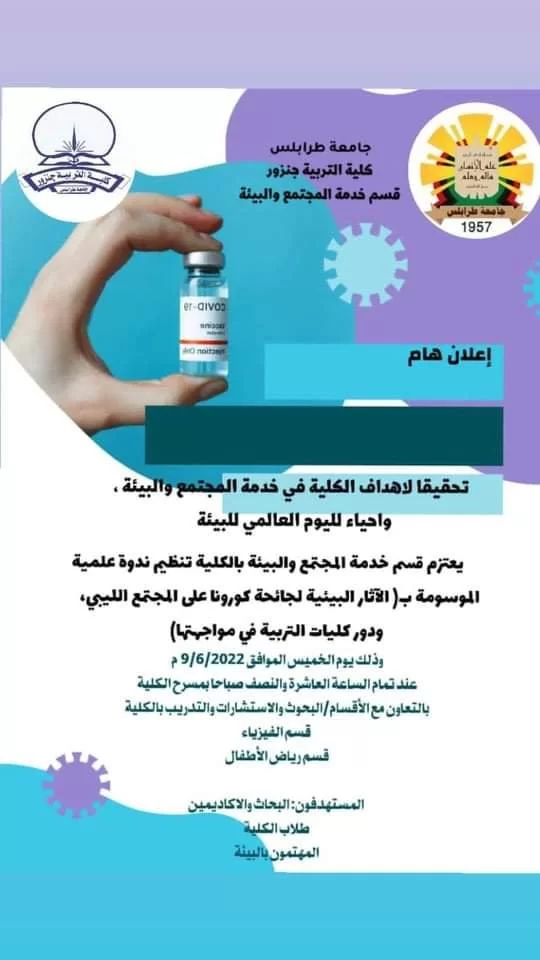 نظم قسم خدمة المجتمع والبيئة بالكلية ندوة العلمية الموسومةب(الآثار البيئية لجائحة كورونا على المجتمع الليبي ودور كليات التربية في مواجهتها ) بالتعاون مع الاقسام، قسم الفيزياء، قسم البحوث والاستشارات والتدريب بالكلية، قسم رياض الأطفال يوم الخميس الموافق 9/6/2022م عند تمام الساعة العاشرة