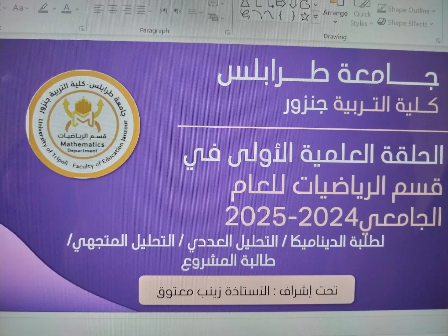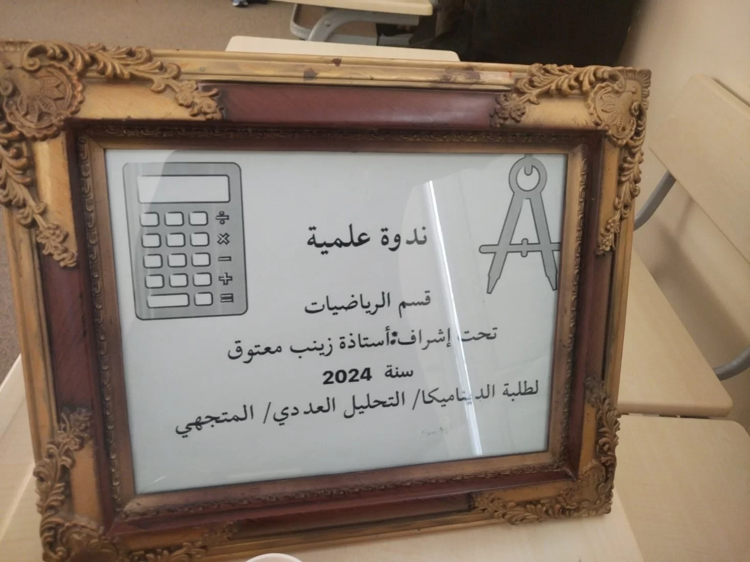 أقام يوم الخميس الماضي محاضرة علمية عن الرياضيات بإدارة طالبات الديناميكا والتحليل العددي والتحليل المتجهي وطالبة لديها مشروع تخرج له علاقة بالمحاضرة بأشراف الاستاذة زينب معتوق وقد حضر لفيف من اساتذة وموضفي القسم ورئيس قسم الرياضيات ورئيس قسم التوثيق والمعلومات وتخلل المحاضرة العديد من الفقرات المميزة وعرض النماذج من تصميم بعض الطالبات