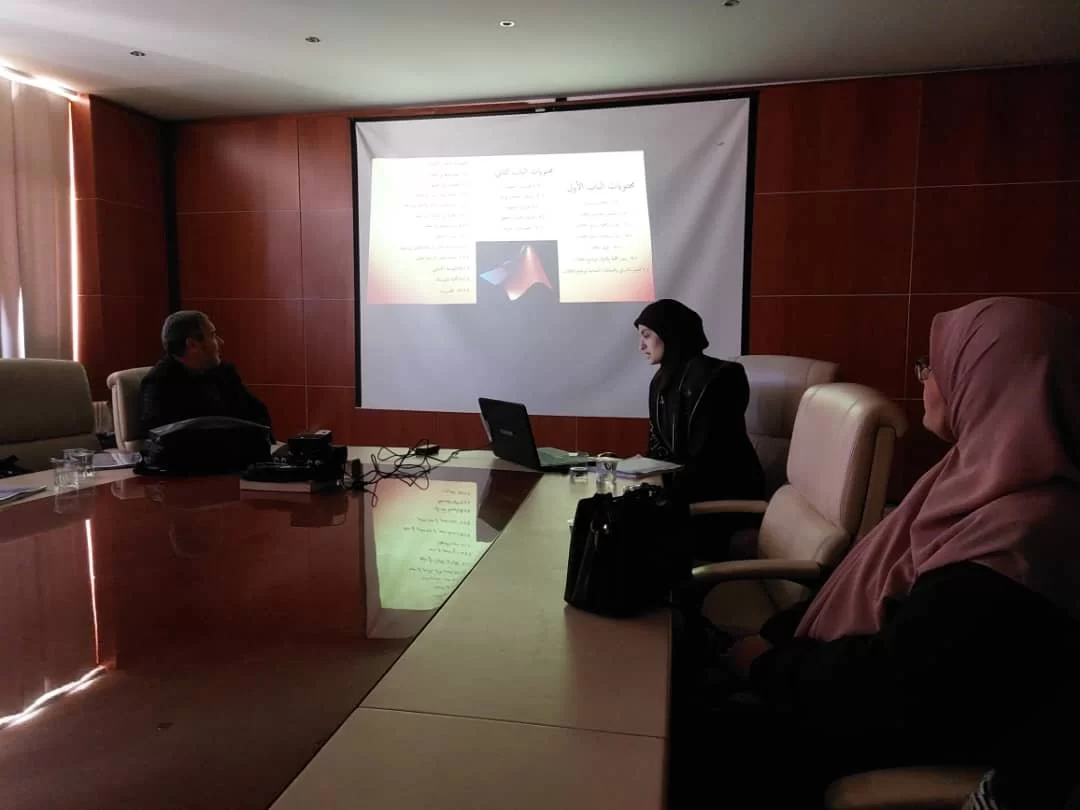 في إطار استكمال متطلبات التخرج أقيمت الأسبوع الماضي مناقشة لطالبة الا امبية وقد بدأت الطالبة المناقشة بالشكر الخاص لعيد الكلية الدكتور عبد اللطيف عبد السلام شعبان لما قدمه لها وخصوصاً ان المشروع له علاقة بمادة الماتلاب ومن ثم شكرت رئيس القسم و اساتذة القسم ووالديها وكل الحضور وكانت المناقشة فعالة ومهمة لطالبة ولكل الحضوز