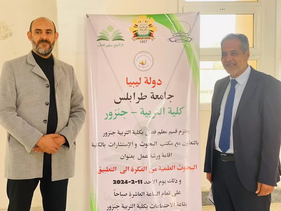 أقيمت صباح الأحد الماضي ورشة عمل بعنوان البحوث العلمية من الفكرة إلى التطبيق، قدمتها الدكتورة هدى الرواب والاستاذ سالم غليليب، بإشراف وتنظيم قسم معلم فصل قسم البحوث والاستشارات بكلية الترببة جنزور، وذلك ضمن الفعاليات والورش التي ينظمها للفصل الحالي حسب الخطة الفصلية، شهدت الورشة حضور ومشاركة قامات علمية من مختلف الجامعات الليبية و ثلة من أعضاء هيئة التدريس بالقسم وبالكلية ولفيف من طالبات القسم ، استعرض فيها المشاركون بالتفصيل عدة محاور مختلفة للبحث العلمي مثل: الاتجاهات الحديثة في تصميم البحوث التربوية- معايير كتابة الخطة البحثية- شروط اختيار وصياغة مشكلة البحث- معايير تقييم البحوث التربوية- الأخطاء الشائعة في كتابة البحوث التربوية- الضوابط القانونية والأخلاقية في إعداد البحوث، و في نهاية الورشة تم تكريم المشاركين والحضور بشهائد تقدير.