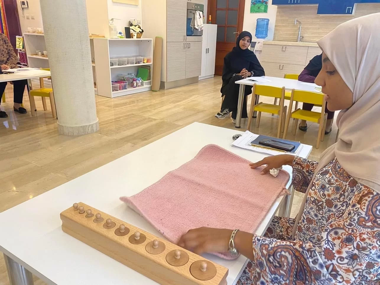 حيث قامت المدربة مواهب بشرح ركن الحياة الحسية في منهج المونتسوري وكان هناك تفاعل وتجاوب رائع بين الجميع وما ان مضي الوقت سريعا وبدون الشعور به حتى جاء موعد الدورة الثانية الاكثر من رائعة حيث قامت المدربة سارة الليد بسرد شرح متسلسل ودقيق عن التطبيقات العملية في التحليل السلوك التطبيقي والنموذج الثلاثي