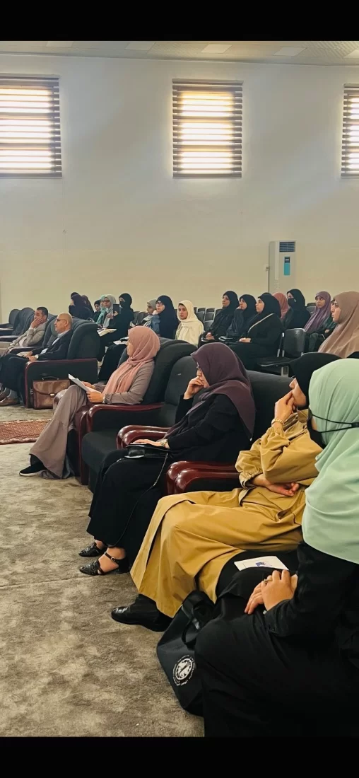 رئيسة القسم أ. ربيعة حسين ومنسق الدراسة والامتحانات بالقسم أ. خلود ومدير مكتب شؤون اعضاء هيئة التدريس بالكلية د. ابراهيم الدويبي ود.سالم ابو راوي منسق البحوث والاستشارات ود. محمد حبيل ود. فاطمة المقرحي منسق النشاط و أ. فاطمة بن عثمان و د. منال مادي منسق التربية العملية ود. نجاح عبدالجليل منسق المشاريع وتشرفنا بحضور د. محمد الساحلي منسق التربية العملية بالكلية