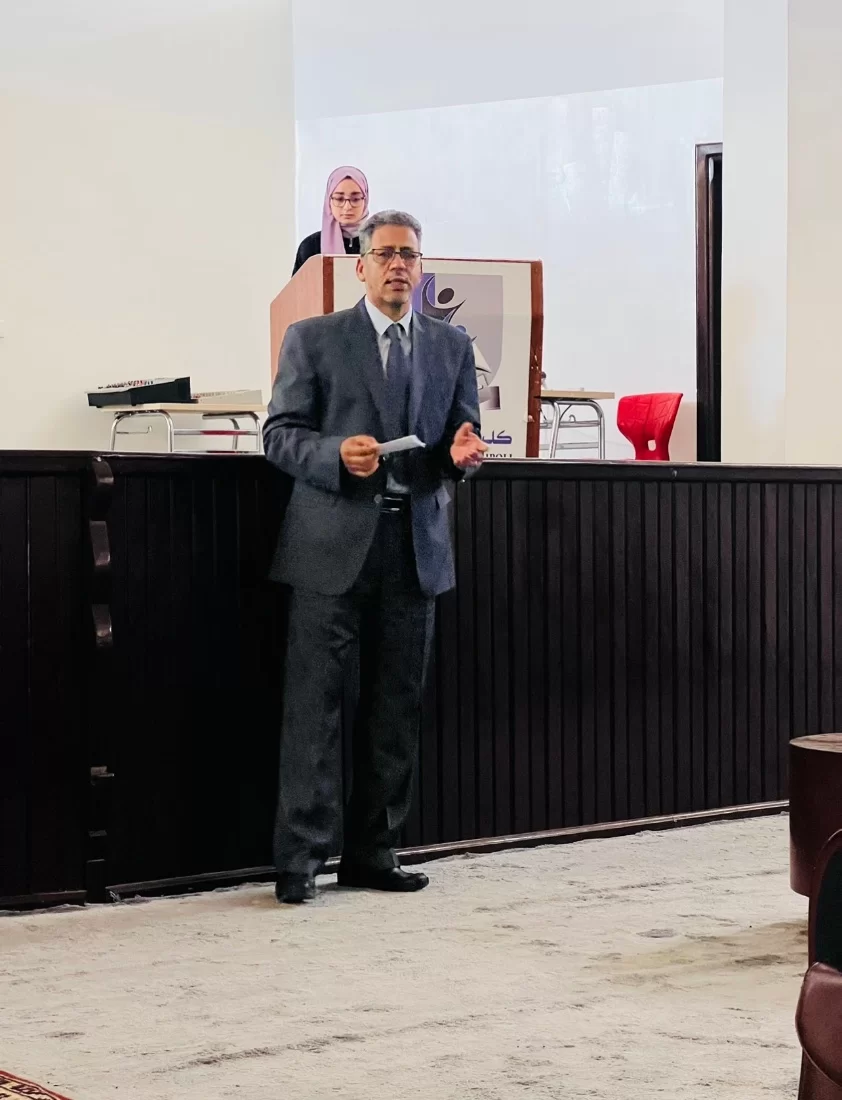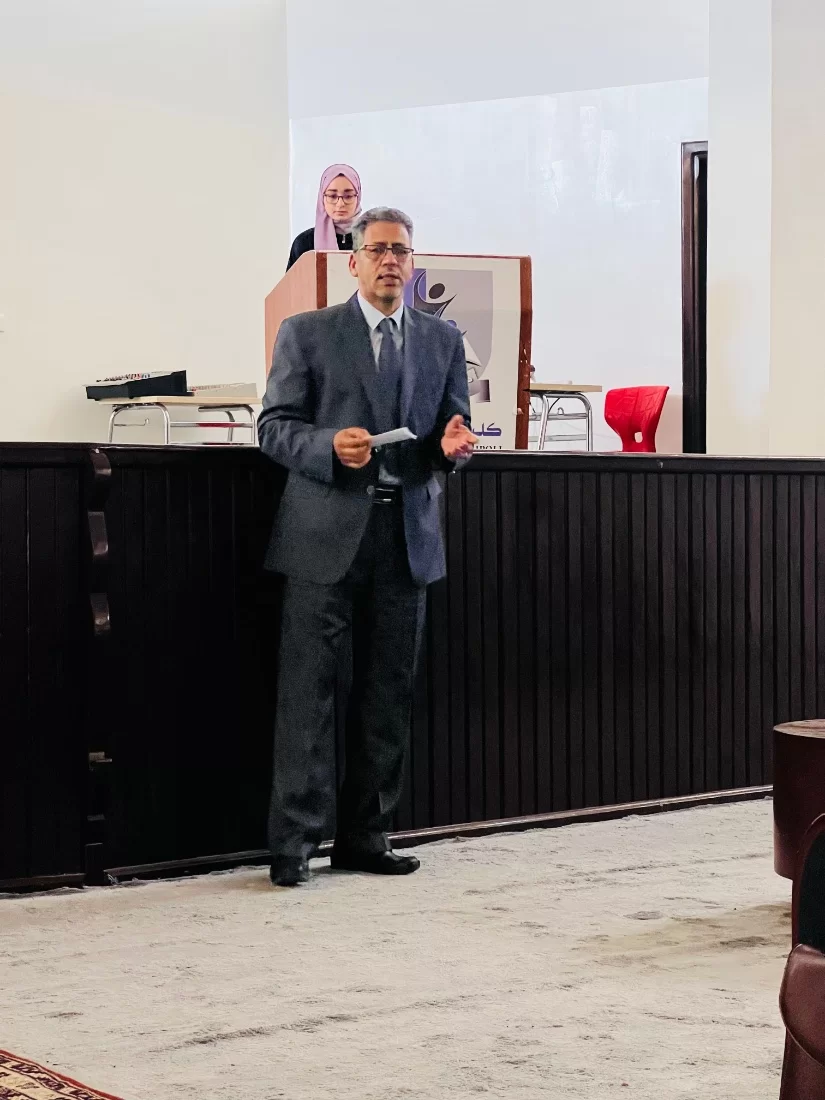 من تم اعطيت الكلمة نيابة عن اعضاء هيئة التدريس الي د. سالم ابو راوي الذي بدوره قدم النصائح والارشادات العلمية والعملية للطالبات وحثهم علي ضرورة الاهتمام بهذا التخصص والالتزام والمواظبة بحضور كل المناشط والمتلقات والندوات التي تعني بشؤون الاشخاص ذوي الاعاقة
