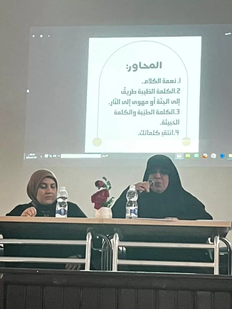في أجواء طيبة موفقة ، ألقت اليوم الثلاثاء الموافق 30-1-2024 على مسرح الكليةالدكتورة إيناس شلوف محاضرتها المعنونة : (الكلمة وأثرها على القلوب ) التي تطرقت فيها إلى عدة محاور و هي : 1- نعمة الكلام .2- الكلمة طريق إلى الجنة أو مهوى إلى النار .3- الكلمة الطيبة و الكلمة الخبيثة .4- انتقِ كلماتك .فلها كل الشكر على ماتفضلت به من كلمات تحفيزية على الكلمة الطيبة و أثرها علة المستمع ، و الشكر موصول أيضا للدكتورة كلثوم ارحيمة التي مهدت للمحاضرة و احتفت بمعدتها ، بكلمات راقية و ثناء باذخ ، بمعية الحضور من رئيس القسم المكلف د. ليلى الزقوزي ، و منسق النشاط د. ناهد الباجقني ، و طالبات الكلية اللائي عبّرن عن شديد إعجابهن و استفادتهن من المحاضرة القيّمة مع تمنيات بالإكثار من مثل هذه المحاضرات .