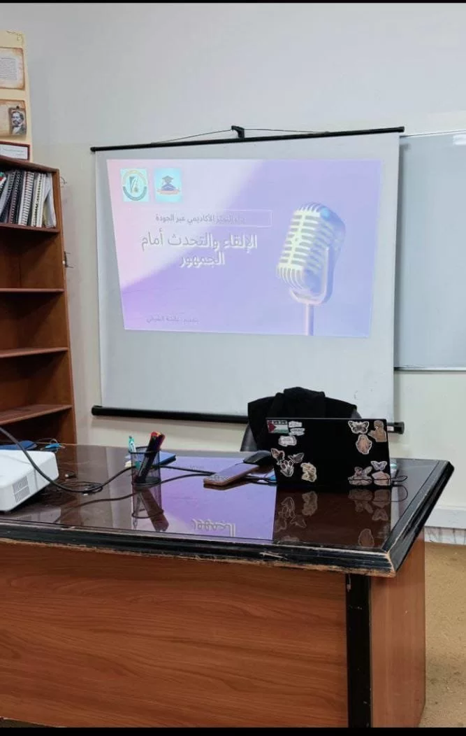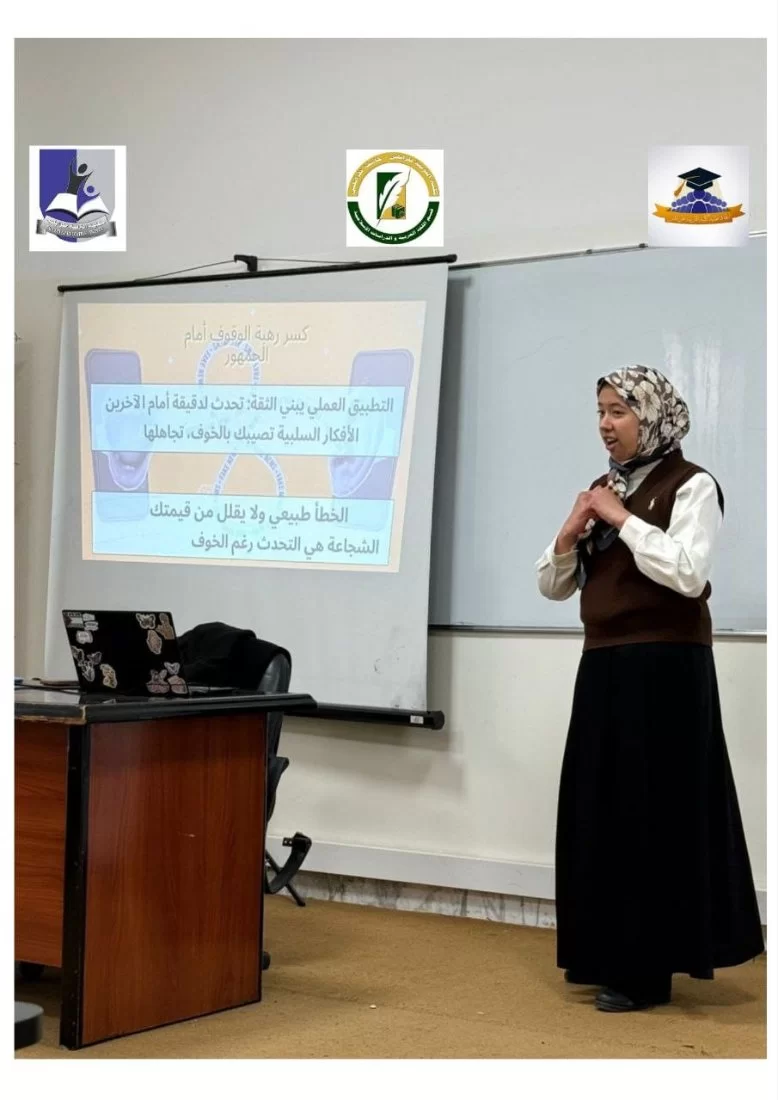 أقيمت صباح يوم الاثنين الموافق 26/1/2026م  ورشة تدريبية بقاعة المرحوم الفتحلي ، تحت عنوان مهارة الإلقاء والتحدث أمام الجمهور، من تقديم الطالبة (عائشة الشيخي) طالبة بقسم اللغة العربية والدراسات الإسلامية ،  وبالتعاون مع اتحاد الطلبة بالكلية ،حيث استهدفت الورشة عدد من أعضاء هيئة التدريس و الطالبات  بالكلية .