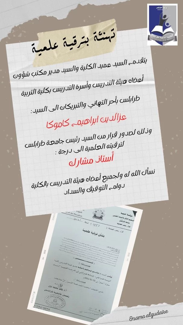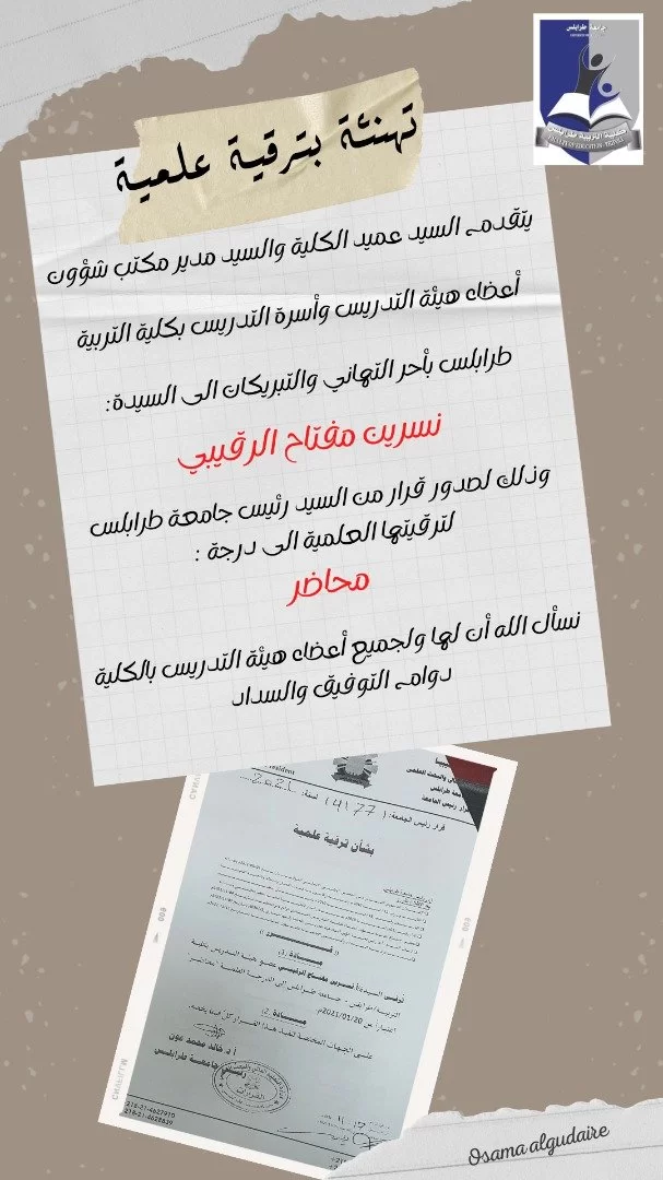 يتقدم السيد عميد الكلية والسيد مدير مكتب شؤون أعضاء هيئة التدريس وأسرة التدريس بكلية التربية طرابلس بأحر التهاني والتبريكات الى أعضاء هيئة التدريس الذين صدر في حقهم قرار من السيد رئيس جامعة طرابلس لترقيتهم العلمية.