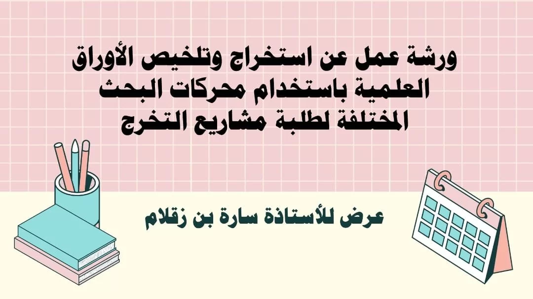 قدمت الورشة الأستاذة سارة بن زقلام، عضو هيئة التدريس بقسم الأحياء ورئيس قسم النشاط الطلابي بالكلية. تناولت الورشة تقديم أكثر محركات البحث المعروفة في استخراج الأبحاث والكتب ورسائل الدكتوراه والماجستير، بالإضافة إلى بعض البرامج التي تترجم وتلخص الأوراق العلمية.هذه الورشة تعد فرصة رائعة لطلابنا لتعلم كيفية استخدام أدوات البحث العلمي بفعالية، وكيفية تلخيص الأوراق العلمية والاستفادة منها في مشاريعهم التخرج.نشكر كل من ساهم في إنجاح وتقديم هذه الورشة ونتطلع إلى المزيد من الأنشطة العلمية المثمرة في المستقبل.
