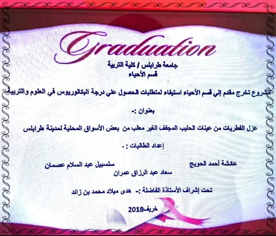 التخرّج هو حصاد سنواتٍ قضاها كل طالبِ علمٍ سعى واجتهد وثابر ليحقق أمنيته وأمنية كل من دعموه ووقفوا إلى جانبه وقدموا له يد العون ليصل لهذا اليوم المنتظر، وعلى قدر الطموح والاجتهاد يكون الحصاد مثمرآ…هنيئاً لنا تخريج دفعة جديدة من طالباتنا العزيزات فقد بذلنّ قصارى جهدهنّ وتفوقنّ وأخلصنّ العمل للوصول إلى هذه اللحظة التي طالما انتظرنّها من بداية مشوراهنّ الدراسي ألا وهي إعلانهنّ خريجات..فلقد اختتم قسم الأحياء الأسبوع الماضي مناقشة مشاريع التخرج لعدد من طالباته واللاتي بلغ عددهنّ (23) طالبة، لنيل درجة البكالوريوس في العلوم والتربية، حيث شهد القسم أسبوعا حافلا بالمناقشات بدأها يوم الخميس الموافق: 31\1\2019 واختتمها يوم الخميس الموافق: 7\2\ 2019 م، وتشكلت عدة لجان ممتحنة من أعضاء هيئة التدريس بالقسم أشرفت على مناقشة هذه المشاريع وتم تقسيمها إلى عدة مجموعات على مدار الأسبوع وفق تخصص كل مجموعة، وشملت المشاريع تنوعآ في الدراسات التي أنجزتها الطالبات، وشملت عدة مواضيع مختلفة: