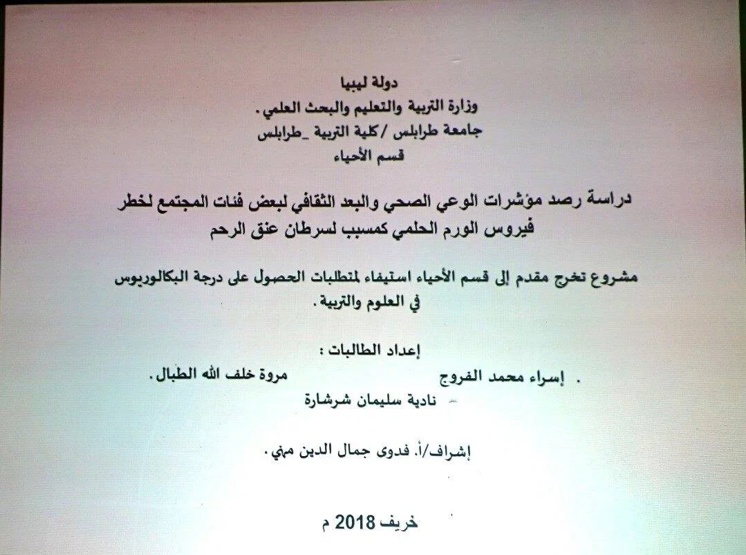 * دراسة رصد مؤشرات الوعي الصحي والبعد الثقافي لبعض فئات المجتمع لخطر فيروس الورم الحلمي كمسبب لسرطان عنق الرحم