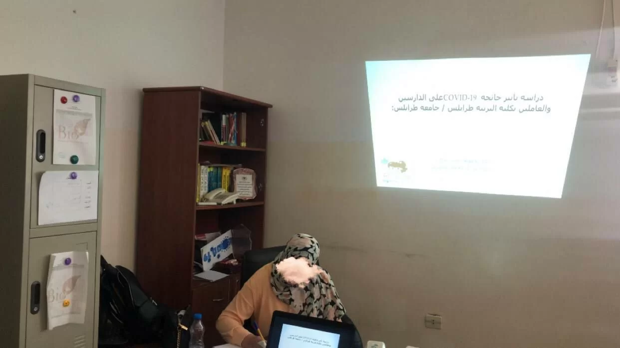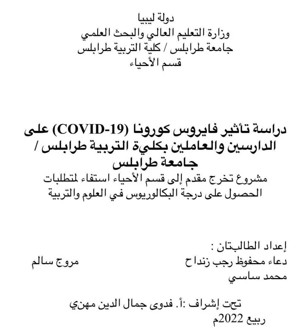 دعاء محفوظ زنداح ، مروج سالم ساسي بعنوان (دراسة تأثير جائحة فايروس كورونا COVID-19على الدارسين والعاملين بكلية التربية طرابلس / جامعة طرابلس) تحت إشراف أ.فدوى مهنى