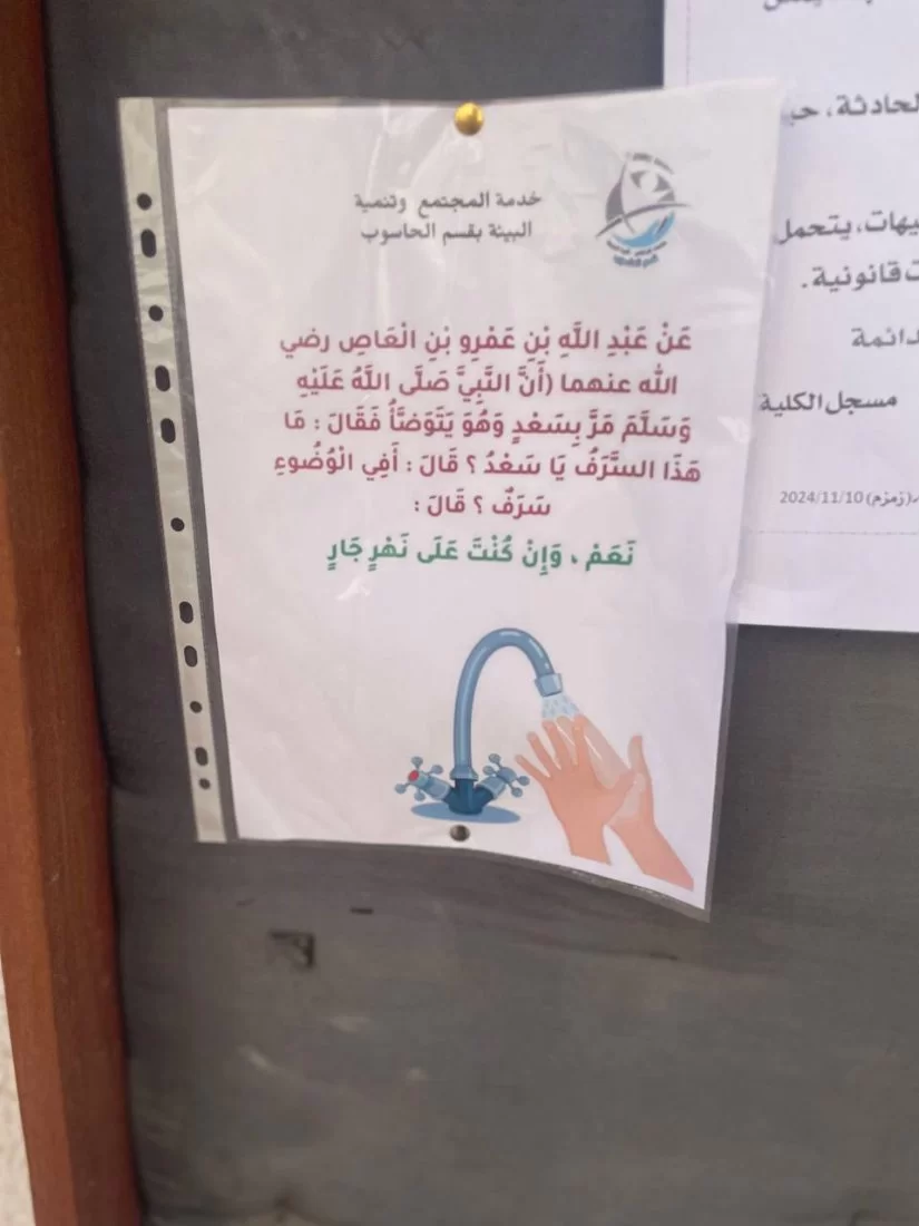نظم فريق خدمة المجتمع وتنمية البيئة بقسم الحاسوب ، حملة توعوية بيئية، حيث قام الطلاب بتوزيع مجموعة من الملصقات التوعوية في مختلف أرجاء الكلية.وقامت الطالبة مودة الميلادى، عضو فريق النشاط، بتصميم هذه الملصقات التي تتضمن مجموعة من النصائح والإرشادات للحفاظ على البيئة. وقد تم اختي