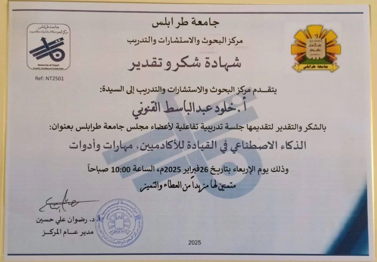 مركز البحوث والاستشارات والتدريب بجامعة طرابلس يقدم شهائد شكر وتقدير إلى السادة والسيدات فريق توظيف الذكاء الاصطناعي لتقديمهم جلسة تدريبية تفاعلية إلى مجلس جامعة طرابلس