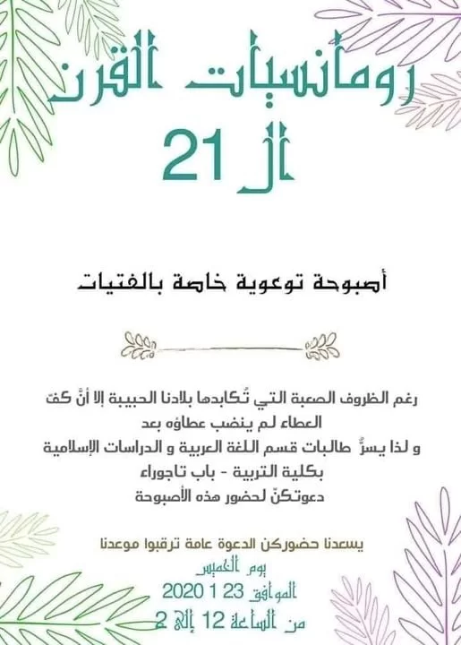 ضمن سلسلة الانشطة للعام 2020م التي يقوم بها قسم اللغة العربية و الدراسات الاسلامية اصبوحة توعوية للفتيات بعنوان رومانسيات القرن الواحد و العشرين