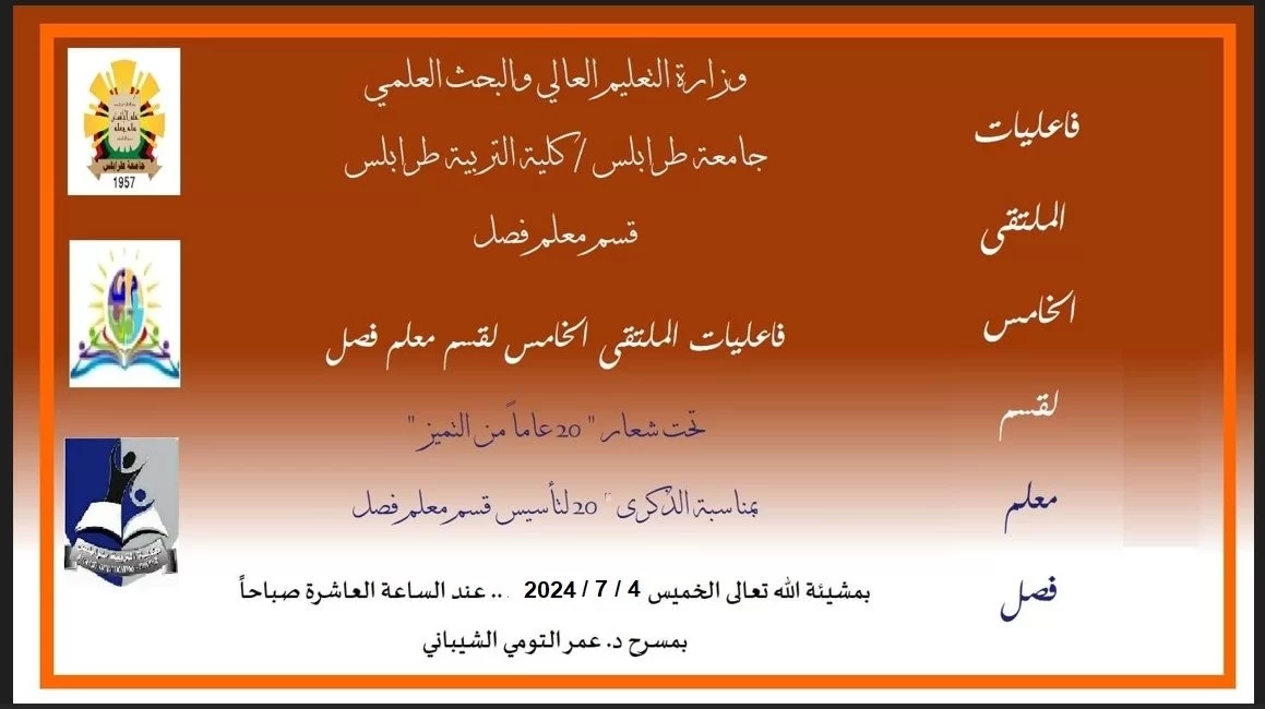 انطلقت اليوم الخميس الموافق 4/7/2024 في تمام الساعة 10.30 صباحا النسخة الخامسة من الملتقى الطلابي الخامس لقسم معلم فصل بكلية التربية طرابلس بمسرح المرحوم الدكتور عمر التومي الشيباني ، بعنوان "20 عاما من التميز"