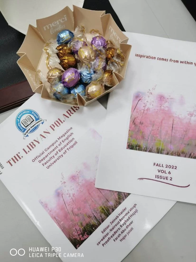 فريق مجلة قسم اللغة الإنجليزية The Libyan Polaris يعلن اليوم عن صدور العدد السادس من المجلة. فريق تميز بالعمل والإبداع وتمكن من إنجاز المهمة في وقت قصير. العدد من تأليف طالبات القسم٫ و أعضاء هيئة تحرير المجلة نخبة من المبدعات المتميزات في مجال الكتابة. الفريق يضع العدد بين أيدي القراء متمنينا أن