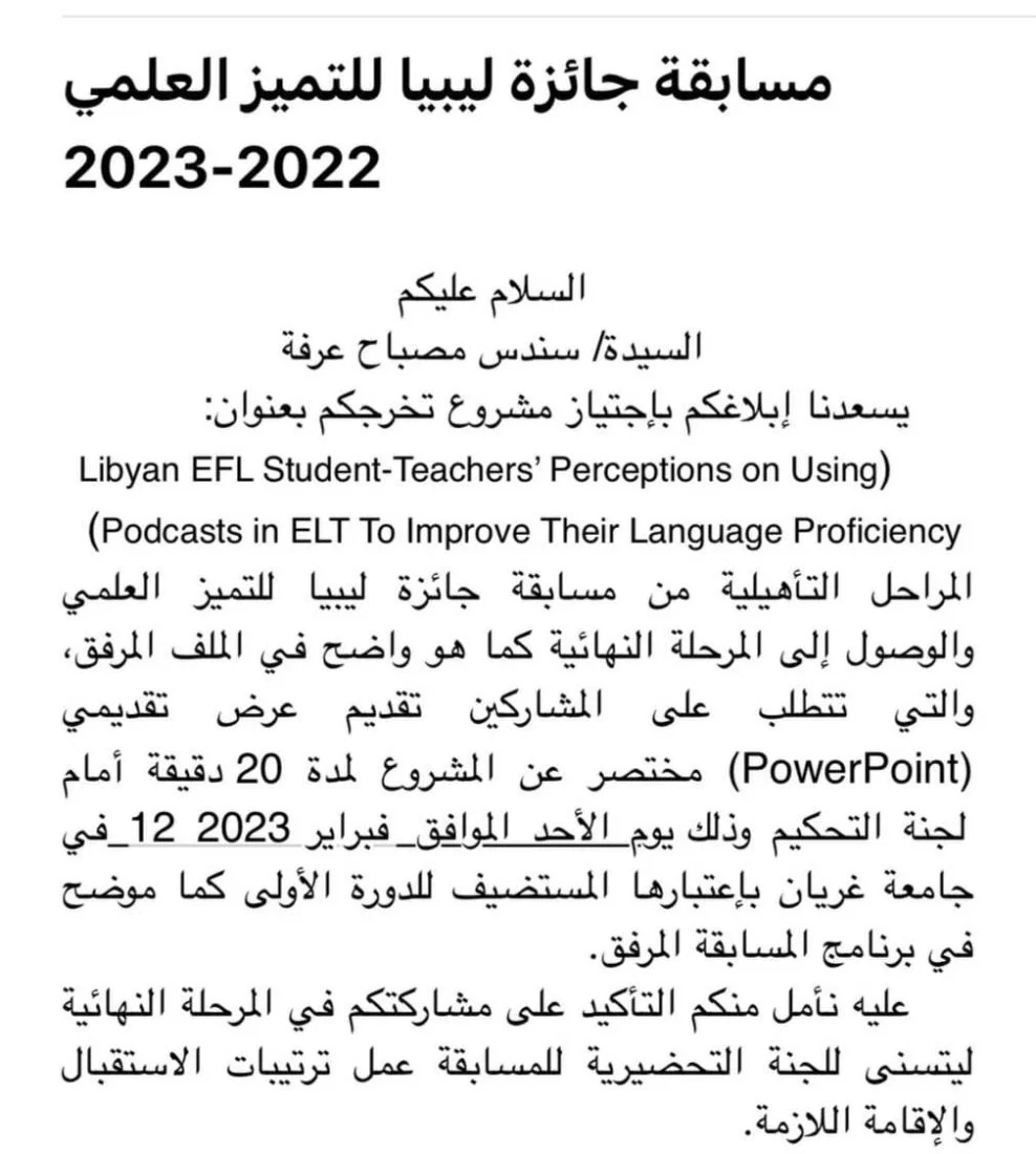 ترشح مشروع الخريجة المميزة بقسم اللغة الإنجليزية سندس عرفة للمرحلة التأهيلية من مسابقة جائزة ليبيا للتميزالعلمي.