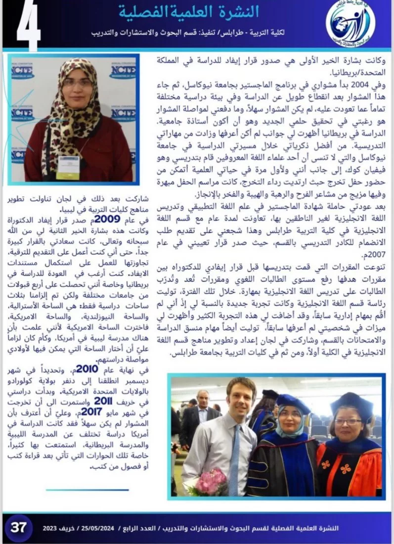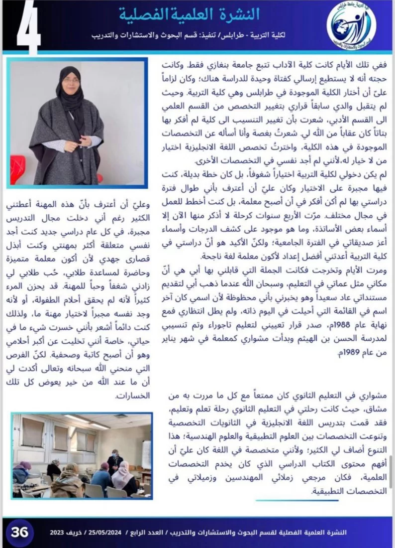 صدر العدد الرابع من النشرة العلمية الخاصة بقسم البحوث والاستشارات والتدريب بكلية التربية طرابلس الذي يتم فيه الاحتفاء بإنتاج أعضاء هيئة التدريس العلمي المتمثل في البحوث المنشورة في المجلات العلمية ومشاركاتهم في المؤتمرات العلمية وتنفيذهم للورش العلمية والدورات التدريبية.وقد تم تخصيص صفحات في هذا العدد للدكتورة انتصار الشريف أحد أعضاء هيئة التدريس بالقسم للحديث عن أهم المحطات في مسيرتها العلمية والمهنية آملة فيه أن تحفز مسيرتها العلمية الطالبات على بذل المزيد من الجهد وتحقيق الآمال التي قد تبدو صعبة المنال.بامكانكم الإطلاع على العدد كاملا من خلال الرابط التالي: https://www.facebook.com/share/p/VQCDmwwtpTt7EPo8/?mibextid=xfxF2iمنسق التوثيق و المعلومات