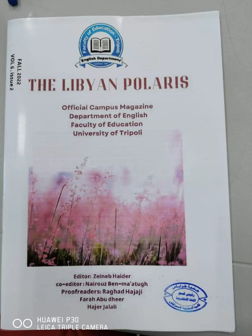 فريق مجلة قسم اللغة الإنجليزية The Libyan Polaris يعلن اليوم عن صدور العدد السادس من المجلة. فريق تميز بالعمل والإبداع وتمكن من إنجاز المهمة في وقت قصير. العدد من تأليف طالبات القسم٫ و أعضاء هيئة تحرير المجلة نخبة من المبدعات المتميزات في مجال الكتابة. الفريق يضع العدد بين أيدي القراء متمنينا أن ينال رضا الجميع.