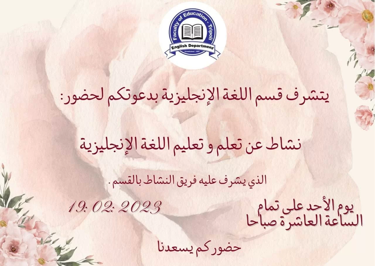 يتشرف قسم اللغة الإنجليزيــة بدعوتكم لحضور نشاط عن تعلم وتعليم اللغة الإنجليزية الذي يشرف عليه فريق النشاط بالقسم وذلك يوم الاحد الموافق 2023/2/19 الساعة العاشرة بمسرح الكلية وسيكون على هامش النشاط الطلابي معرض مصغر لعرض وبيع الكتب باللغتين العربية والإنجليزية .