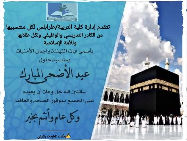 تتقدم إليكم إدارة كلية التربية بأسمى آيات التهاني والتبريكات بمناسبة حلول عيد الأضحى المبارك، سائلين المولى أن يتقبّل منّا ومنكم صالح الأعمال وأن يُعيده علينا وعليكم وعلى الأمة الإسلامية باليُمنِ والبركات، وأن يمُنَّ الله على بلادنا بالأمن والازدهار.تقبّل الله طاعتكم وأتمّ عليكم بهجة العيد وأنعم عل