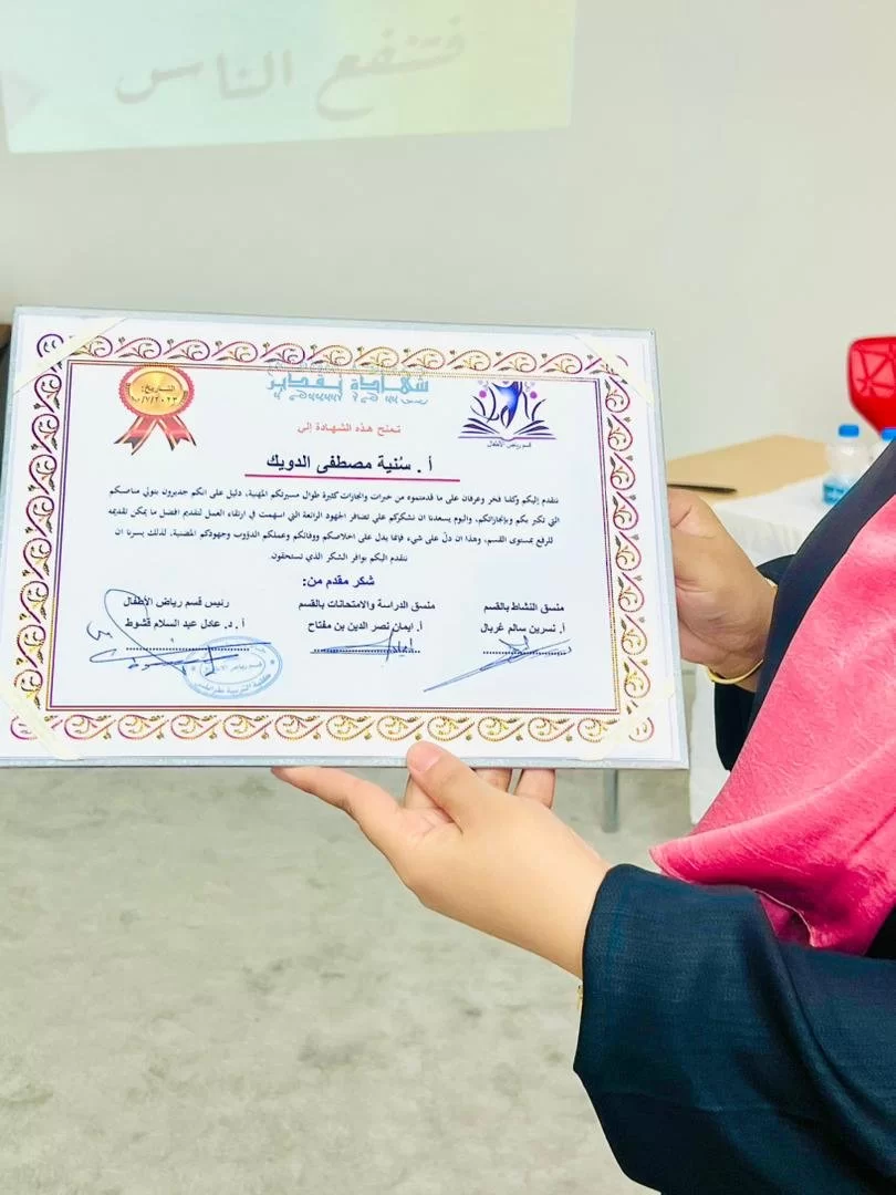 شهادة شكر وتقدير للأستاذة . سنيه دويك