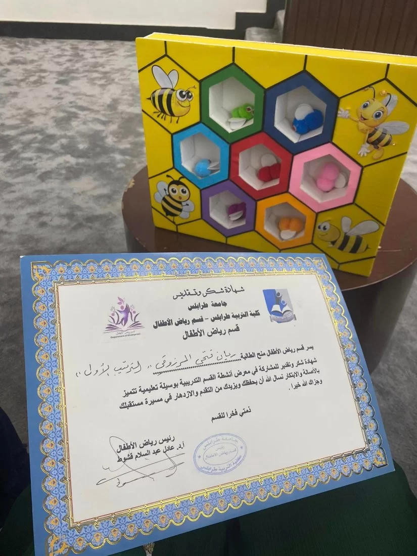 #معرض_إبداع_طالبات قسم رياض الأطفال - كلية التربية طرابلس بعد تقييم الأعمال الطالبات المشاركات، ثم إعلان النتائج وتم تكريم كلٌ من: #الأستاذة_الفاضلة أ. سعاد ميلاد الصيد لدورها الفعال في انشطة القسم والمساهمة العلمية لخبرتها وتفانيها في آداء مهامها بالقسم، تستحقين منا كل الحب والاحترام والتقدير لهذا العمل المتفاني. كذلك تم تكريم #الدكتور الفاضل د. محمد الجمل عضو هيئة تدريس بقسم التربية الفنية والمتعاون مع قسم رياض الأطفال في تدريس مادة مهارات الأساسية في التربية الفنية والذي كان له اسهامات في دعم أنشطة القسم نشكره جزيل الشكر والعرفان على المجهود الذي تقدمه من أجل طالباتنا، تستحق منا كل الشكر والتقدير والاحترام لهذا العمل المتفاني. ثم بعد ذلك تم تكريم الطالبات المشاركات المتميزات بإبداعاتهن. حيث تحصلت الطالبة ريان المرزوقي على الترتيب الأول عن الوسيلة التعليمية ( خلية النحل لتعليم أطفال الروضة الألوان). وتحصلت الطالبة محبة حسن حسنين الترتيب الأول مكرر عن (قصة الكعبة)، كما تم تكريمها عن المشاركة في أنشطة القسم ودعم لجنة النشاط بالقسم طيلة هذا الفصل والتي شاركت بوسائل مميزة ومبدعة فهنيئا للقسم وجودها معنا كل الشكر والتقدير للطالبة محبة ولأسرتها لدعمها وتشجيعها . واللواتي تحصلن على التراتيب الثاني هن: هيفاء البدري ومريم بن مفتاح وميسم الوافي عن (تركيب الصور). والتي تحصلت على الترتيب الثالث اسراء عبد الناصر عن وسيلة الارقام. وتحصلت على الترتيب الرابع سلمى القمودي عن لوحة حقوق الطفل، وثم كرمت الطالبة سلمى وهي احدى خريجات القسم للفصل الدراسي خريف2022م. من مبدعات وموهوبات القسم التي تميزت طيلة فترة دراستها بالإبداع في انتاج الوسائل التعليمية والأعمال الفنية وكانت جل أعمالها تتميز بالأصالة والابتكار ولاننسى تفوقها الدراسي حيث درست بجانب دراستها بالقسم في كلية الصيدلة بجامعة طرابلس وكانت قمة في الالتزام العلمي والأخلاقي وشاركت في جميع أنشطة القسم وقدمت جميع أنواع الدعم لأنشطة القسم نتمنى لمبدعتنا المميزة التفوق دائما والازدهار لها كل الشكر والتقدير . وتم تكريم الطالبات المتفوقات بقسم رياض الأطفال الخريجات الطالبة هناء محمد قدور .والتي تحصلت على تقدير ممتاز بنسبة 93.03% على الترتيب الأول لفصل خريف 2022م وهذا شئ معروف عن الطالبة هناء طيلة دراستها بالقسم لتميزها بالاخلاق والتفوق العلمي خير قدوة لطالبات القسم ونتمنى لها مزيدا من التقدم والازدهار ولاشك فيه أن قسم رياض الأطفال يدعم طالباته المتفوقات ويقدم لهن كل يد العون والمساندة لانهن يمثلن القسم خير تمثيل ومصدر افتخار واعتزاز للقسم لطالباته المميزات. فهنيئا لأسرتها والقسم وجودها معنا. وكرمت الطالبة حليمة علي الرملي احدى خريجات قسم رياض الأطفال للفصل الدراسي خريف 2022م، والتي تميزت طيلة فترة دراستها بالأخلاق والتفوق العلمي والمبدعة في انتاج الوسائل التعليمة والأعمال الفنية موهوبة ومبدعة تستحق كل التقدير والامتتنان ونفتخر بأنها احدى طالبات القسم ورمزا للتفوق والإبداع. كما تتقدم لجنة النشاط بالقسم بالشكر والتقدير للطالبتيناحلام مصطفى الأول / اسراء عبد الناصر أبو عبد اللهعلى مشاركتهن في نشاط القسم وعلى التزامهن ودعمهن لأنشطة القسم والمشاركة في اعداد وتنظيم برامج القسم والاخلاص في أداء مهامهن ومنحنا جزء من وقتهن وجهدهن لهن كل الشكر والتقدير . ونشكر الطالبة اسراء عبد الناصر على المساهمة القيمة بوسائل تعليمية بالمعرض والتي تميزت بالابداع والأصالة . قسم رياض الأطفال نحو التميز والإبداع. لجنة النشاط بقسم رياض الأطفال