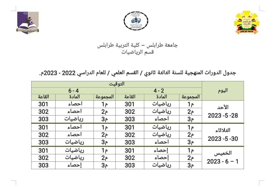 خدمة المجتمع -قسم الرياضياتفي اطار الخدمة المجتمعية ووفقا لمذكرة التعاون المشترك التي تم الاتفاق عليها بين كلية التربية طرابلس ومراقبة التربية والتعليم سوق الجمعة , قامة نخبة من اساتذة القسم بدورات منهجية مجانية تستهدف عدد 120 طالبة من طالبات شهادة اتمام مرحلة التعليم الثانوي "القسم العلمي
