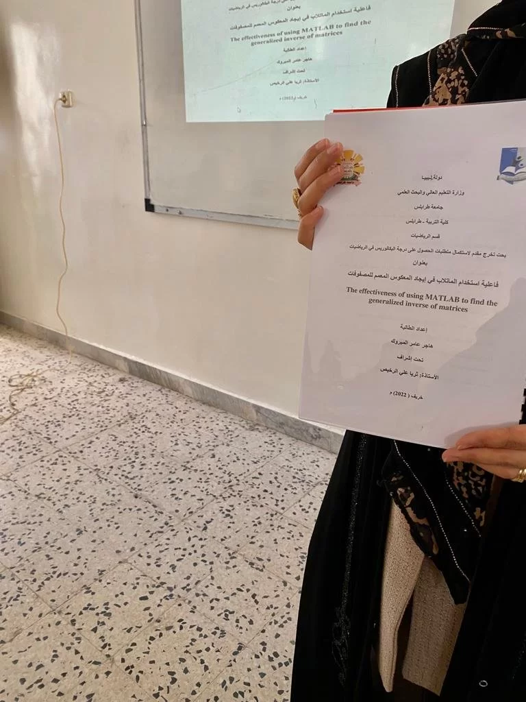 بفضل الله تعالى تمت مناقشة مشاريع التخرج بقسم الرياضيات لفصل الدراسي (خريف 2022 ) .كل الشكر لأعضاء هيئة التدريس بالقسم لما يقدمونه من نصائح وتوجيهات طوال مشوار الدراسة. الف مبارك لخريجات القسم هاجر عامر المبروك ⚘انوار نوري الزروق.⚘هويدة محمد بن رمضان ⚘تسنيم عبد الحكيم نوبة ⚘منال محمود المسلا