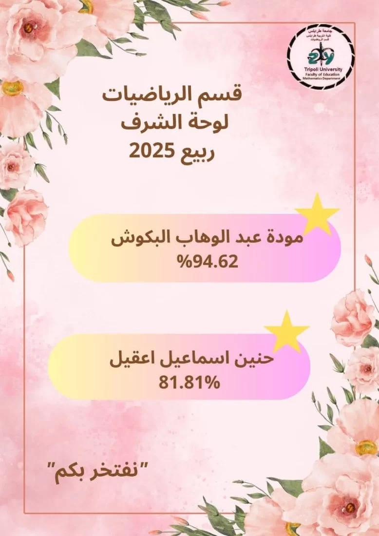 #لوحة_الشرف_قسم_الرياضيات"مسيرةُ تفوّقٍ تُضيءُ القسم. تهانينا لطالبات لوحة الشرف"يفخر قسم الرياضيات بطالباته المتفوقات تقديرًا لجهودهنّ المتميزة وإنجازاتهنّ البارزة.إن تميّزكنّ هو ثمرةُ عملٍ دؤوب وطموحٍ يستحق الاحترام، ونحن نفتخر بكل طالبة جعلت التفوق عادةً لا ح