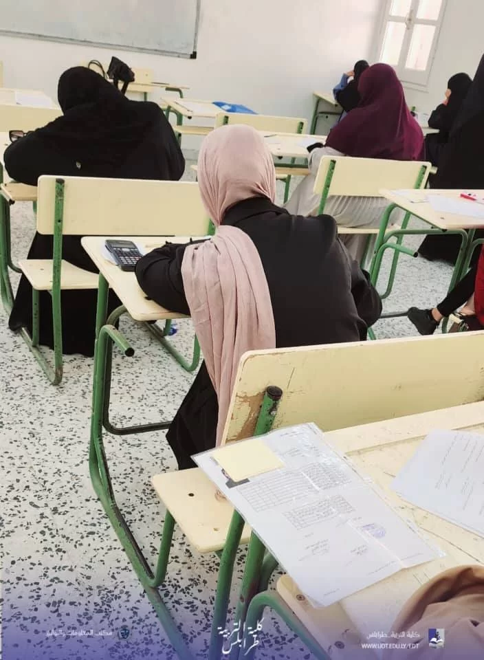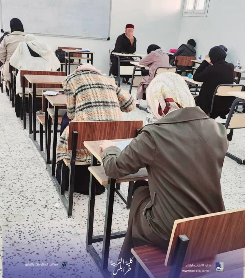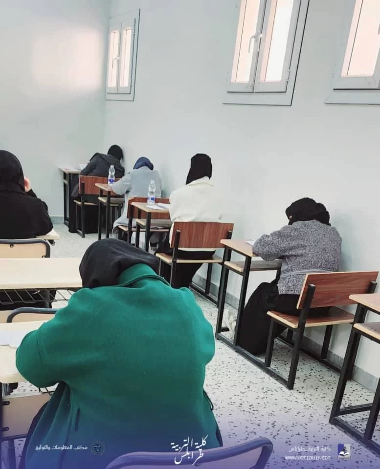 | #متابعات |رصدت عدسة مكتب المعلومات والتوثيق، صباح اليوم الاحد الموافق 28 - 12 - 2025 ، انطلاق الامتحانات النهائية بكلية التربية – طرابلس، للفصل الدراسي خريف 2025م.باشرت لجنة الامتحانات النهائية، برئاسة الدكتورة زينب اللافي، وجميع أعضائها، أعمالها وفق البروتوكولات المعتمدة التي دأبت الكلية على تطبيقها خلال فترات الامتحانات.وفي صباح اليوم الاحد ، استقبلت الكلية طلابها في أول أيام الامتحانات النهائية، وسط تنظيم دقيق وتنسيق متميز. وقد توجّه الطلاب والملاحظون إلى قاعات الامتحان ضمن الفترتين المحددتين، في حين حرصت عميد الكلية، الدكتورة مروة سويدان، على متابعة سير العملية الامتحانية، مع إيلاء اهتمام خاص بكافة الجوانب التنظيمية والفنية.وقد شهد اليوم الأول انسيابية واضحة في سير الامتحانات، بفضل جهود لجنة الامتحانات وتعاون الكادر التدريسي والإداري والحرس الجامعي.تتقدم إدارة الكلية بأطيب الأمنيات للطلبة بالتوفيق والنجاح، وتُثمّن عاليًا جهود فريق العمل واللجان الامتحانية على تفانيهم والتزامهم في أداء مهامهم. م . م. ت