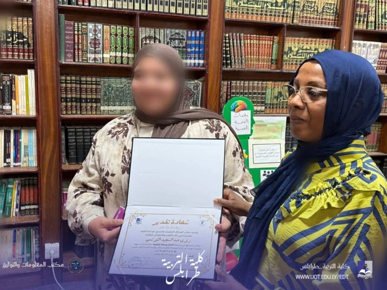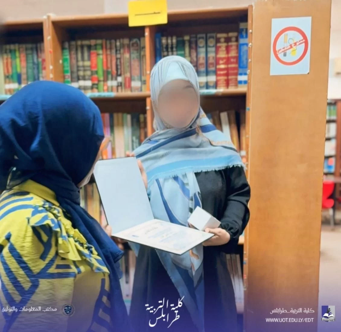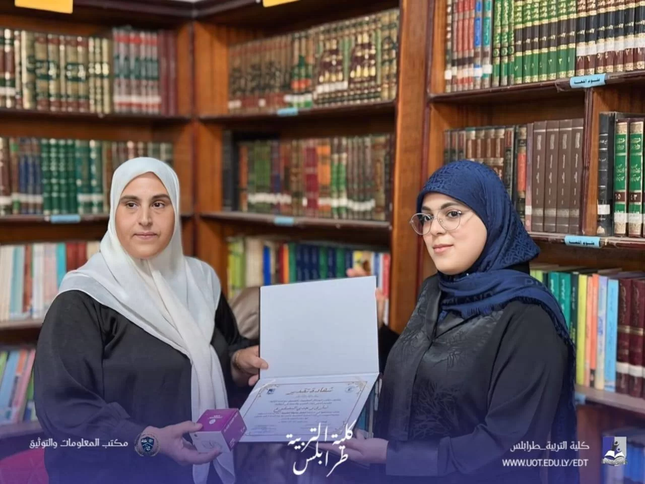 | #متابعات | #كلية_التربية_طرابلس نظّم مكتب الوسائل التعليمية احتفالية لتكريم الطالبات المشاركات في مسابقة “أفضل وسيلة تعليمية” للفصل الدراسي خريف 2025–2026، وذلك في إطار دعم الإبداع الطلابي وتعزيز جودة العملية التعليمية.نتائج المسابقة: المركز الأول: رناد ناصر العالم المركز الثاني: وصال عادل السائح، فرح محمود بن طاهركما تم تكريم باقي المشاركات بمنحهن شهادات تقدير، وذلك تثمينًا لجهودهن، وهن: إيمان محمد المصروب مودة فوزي الشاطر إسراء خليفة صقرروان عادل الفيتوريرؤى عبدالمجيد التونسينمارق وجدي المصقوع هدايا مفتاح وقد تميزت الأعمال المقدمة بمستوى جيد من الجودة والأفكار المبتكرة، بما يعكس روح التنافس الإيجابي بين الطالبات. كما تخلل الحفل عدد من الكلمات التي أكدت على أهمية دعم مثل هذه المبادرات في تنمية المهارات العلمية والتربوية.وفي ختام الفعالية، تم توزيع الجوائز وشهادات التقدير في أجواء إيجابية.يواصل مكتب الوسائل التعليمية دعمه للمبادرات الهادفة إلى تطوير العملية التعليمية والارتقاء بمخرجاتها.مبارك للفائزات، مع التمنيات بالتوفيق للجميع. م. م. ت