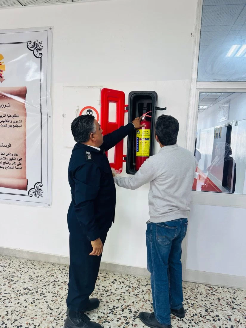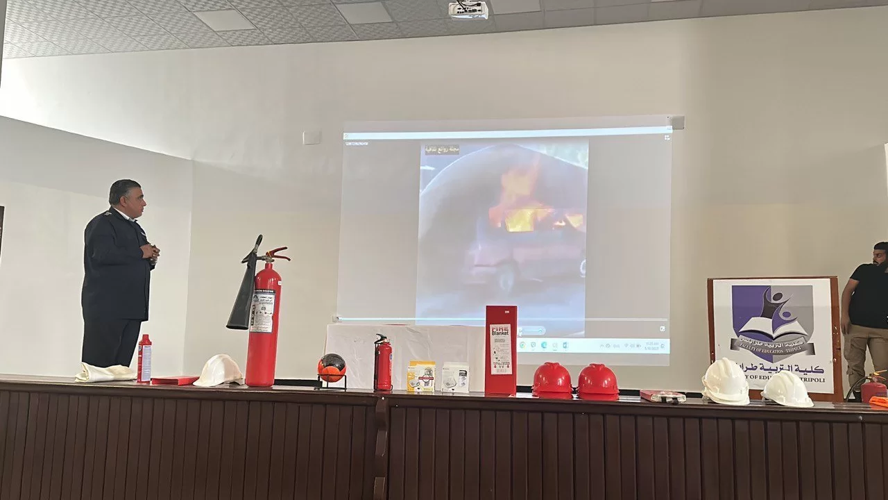 « الدفاع المدني والوسائل المُتّبعة في استخدام طفايات الحريق» بمسرح كلية التربية طرابلس والتي تم التنسيق لها من قِبل منسق وحدة الأمن والسلامة الحيوية والمهنية أ. فدوى مهني بالتعاون مع مكتب النشاط بالكلية، واستهدفت هذه الورشة الكوادر التدريسية والوظيفية بالكلية.