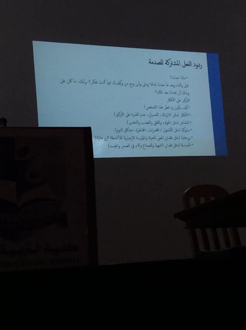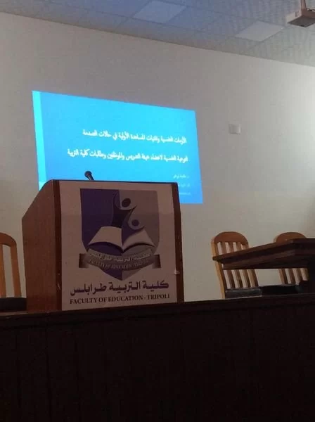 تعتبر جودة الحياة النفسية والرضا الشخصي من المقومات الجوهرية لسعادة الفرد وتنمية ورقي المجتمع لكون الفرد ثروة بشرية فاعلة وهامة، ونظراً لأهمية الدعم والمساندة الأولية وقت الصدمات والكوارث، وحرصاً من مجلس قسم العلوم التربوية والنفسية على سلامة الصحة النفسية والتوعية بأهميتها لأعضاء هيئة التدريس والموظفين وطالبات كلية التربية قامت الدكتورة عائشة أبو حجر عضو هيئة تدريس بالقسم بتنظيم محاضرة علمية بعنوان(الأزمات النفسية وتقنيات المساعدة الأولية في حالات الصدمة)، وذلك يوم الثلاثاء الموافق 14/5/2024 بمسرح الكلية .تناولت فيها نقاط هامة من شأنها توعوية الحضور وتوجيههم لطرق وأساليب ووقت التدخل المناسب ومايجب عمله ومتى يتوقف دور المساندة. كانت محاضرة مفيدة فتح فيها باب الحوار والنقاش وتبادل الأراء وتمت الإجابة على استفسارات وأسئلة الحضور. وتأتي هذه المحاضرة في اطار تنفيذ خطة القسم في مجال خدمة المجتمع والبيئة. وبالتنسيق مع منسق النشاط بالقسم. مزيداً من التألق والنشاط المثمر.