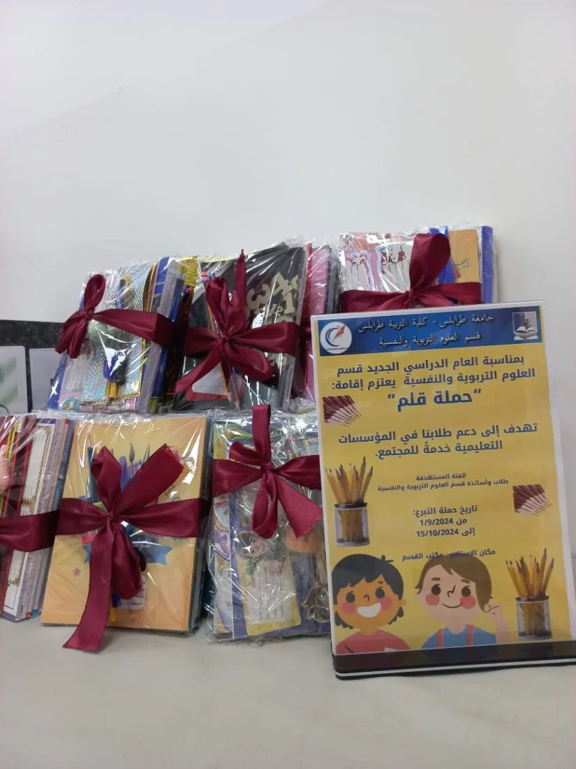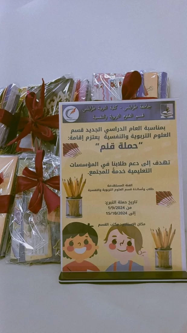 العمل التطوعي هو أقل ما يمكن أن يقدمه الفرد لغيره في المجتمع فهو مبادرة شخصية تنبع من ذات الفرد دون إلزام ولا إجبار وغير مدفوع الثمن، الهدف منه الأجر والثواب والمساهمة في رقي المجتمع بغرس العادات الفاضلة والتعاون والتعاضد والنظر للأخر بعين الود والرحمة والتعايش، وفي هذا الإطار ومن باب تقديم خدمات مجتمعية هادفة ومفيدة، قام أعضاء هيئة التدريس وطالبات قسم العلوم التربوية اليوم الإثنين الموافق 21/10/2024 بحملة تطوعية بعنوان "حملة قلم" حيث تم التبرع بمستلزمات دراسية من أقلام حبر وأقلام جافة وكراسات وغيره ، وتجهيزها لإرسالها لبعض المؤسسات التعليمية لتوزيعها على التلاميذ من ذوي الأسر محدودة الدخل بالتعاون مع مدراء هذه المؤسسات. أشرف على هذه الحملة منسقة النشاط بالقسم والفريق التطوعي من الطالبات كل الشكر والتقدير لهم على جهودهم وجزاهم الله كل خير